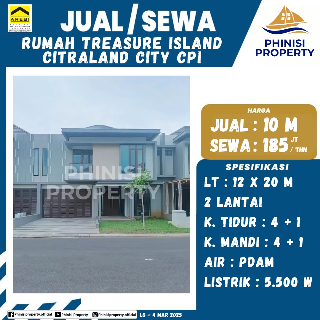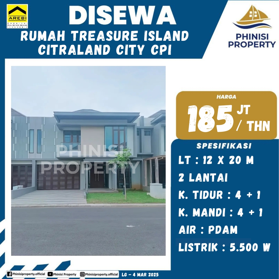Rumah dua lantai di Treasure Island Citraland City CPI ini tersedia untuk disewa. Dengan luas tanah 12 meter x 20 meter, totalnya adalah 240 meter persegi. Properti ini memiliki empat plus satu kamar tidur dan empat plus satu kamar mandi, dilengkapi dengan air PDAM dan listrik 5.500 watt. Lokasinya yang strategis dan fasilitas yang lengkap menjadikannya pilihan ideal untuk hunian keluarga yang mencari kenyamanan.