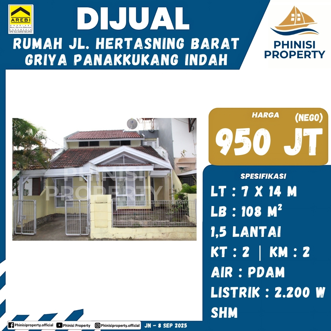 Rumah dua lantai di Jalan Hertasning Barat, Griya Panakkukang Indah, ini adalah pilihan hunian yang nyaman dan strategis. Dengan luas tanah 7 x 14 meter atau 98 m² dan luas bangunan 108 m² (1,5 lantai), properti ini menawarkan ruang yang optimal. Rumah ini memiliki 2 kamar tidur dan 2 kamar mandi, dilengkapi dengan fasilitas air PDAM dan daya listrik 2.200W. Legalitasnya pun terjamin dengan Sertifikat Hak Milik (SHM). Properti ini adalah pilihan yang ideal bagi Anda yang mencari hunian nyaman di lokasi strategis.