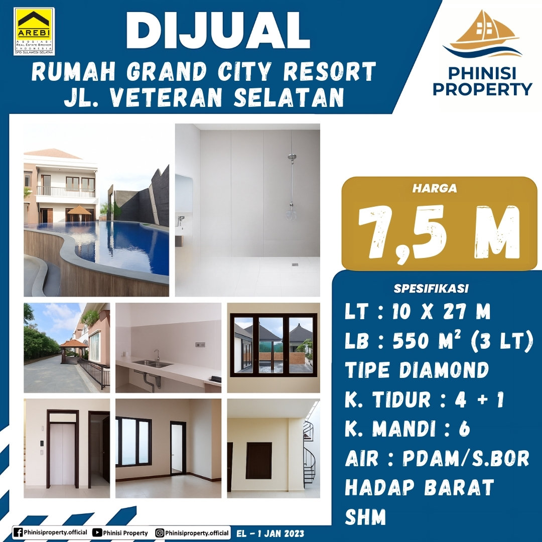 Ingin tinggal di hunian mewah dan strategis di Makassar? Rumah di Grand City Resort, Jalan Veteran Selatan, bisa jadi pilihan ideal. Rumah Tipe Diamond ini memiliki luas tanah 10 x 27 meter persegi dan luas bangunan 550 meter persegi, yang terdiri dari 3 lantai. Dilengkapi dengan 4 1 kamar tidur dan 6 kamar mandi, rumah ini menghadap ke Barat dan memiliki fasilitas air PDAM/sumur bor. Dengan Sertifikat Hak Milik (SHM) dan lokasi yang strategis, properti ini menawarkan kenyamanan dan nilai investasi yang sangat tinggi.