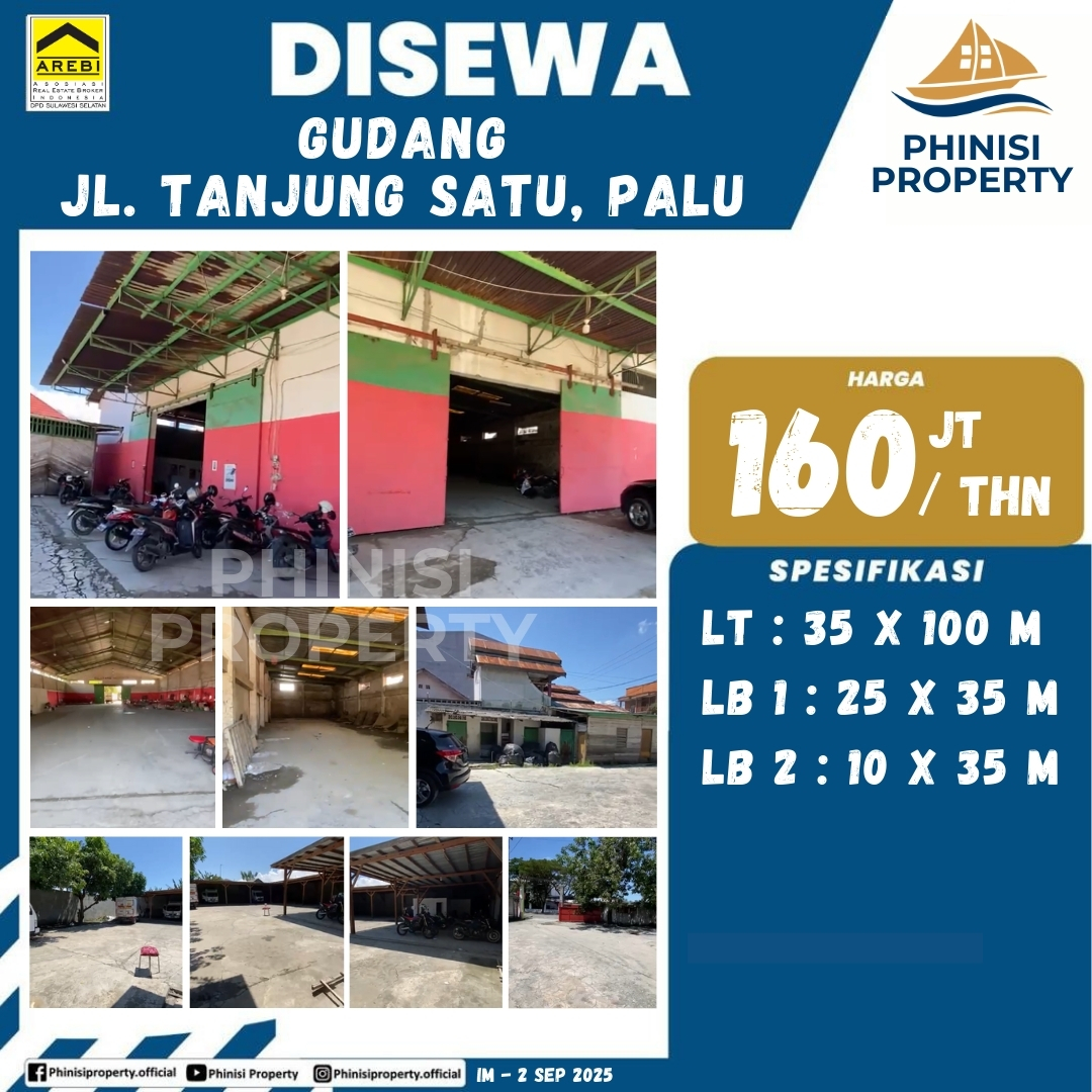 Gudang multifungsi ini berlokasi strategis di Jalan Tanjung Satu, Palu, dan tersedia untuk disewa. Properti ini berdiri di atas tanah yang sangat luas, yaitu 35 x 100 meter, atau 3.500 m2. Terdapat dua bangunan gudang di dalamnya, yaitu LB 1: 25 x 35 meter (luas 875 m2) dan LB 2: 10 x 35 meter (luas 350 m2). Dengan total luas bangunan 1.225 m2, gudang ini sangat ideal untuk berbagai keperluan bisnis, seperti penyimpanan, distribusi, atau workshop.