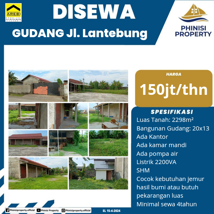 Gudang Sewa jl. Lantebung LT 2298m2 LB 260m2 Ada Kantor dan Toilet SHM Cocok utk kebutuhan jemur hasil bumi Atau yang butuh pekarangan luas.