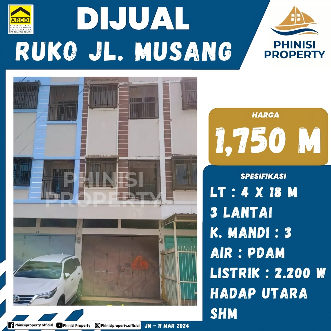 Ruko tiga lantai ini berlokasi strategis di Jalan Musang, Makassar, dan sangat cocok untuk berbagai jenis usaha. Properti ini memiliki luas tanah 72 m² yang berasal dari perkalian 4 x 18 meter, dan dilengkapi dengan tiga kamar mandi. Fasilitasnya mencakup pasokan air PDAM dan daya listrik 2.200 watt. Menghadap ke arah utara, ruko ini menawarkan potensi bisnis yang menjanjikan.