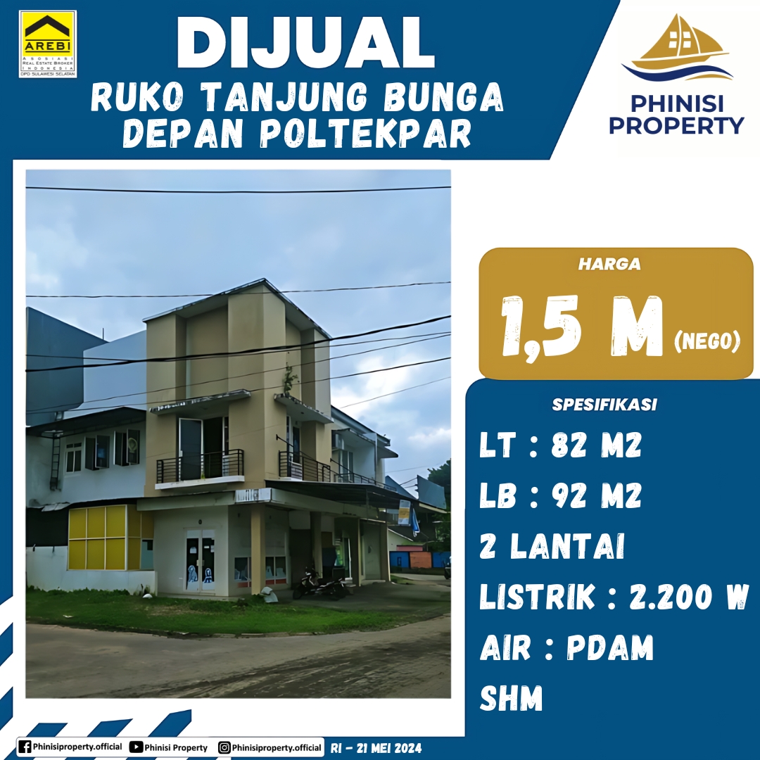 Miliki unit ruko strategis di Tanjung Bunga, tepat di seberang Politeknik Pariwisata, lokasi yang sangat menguntungkan untuk berbagai jenis usaha. Ruko ini memiliki luas tanah 82 m² dan luas bangunan 92 m², yang terbagi dalam dua lantai yang fungsional. Dilengkapi dengan daya listrik 2.200 watt dan air PDAM, ruko ini siap untuk segera digunakan. Dengan status kepemilikan Sertifikat Hak Milik (SHM), properti ini menawarkan jaminan legalitas dan keamanan penuh, menjadikannya pilihan investasi yang cerdas di kawasan pendidikan yang ramai.