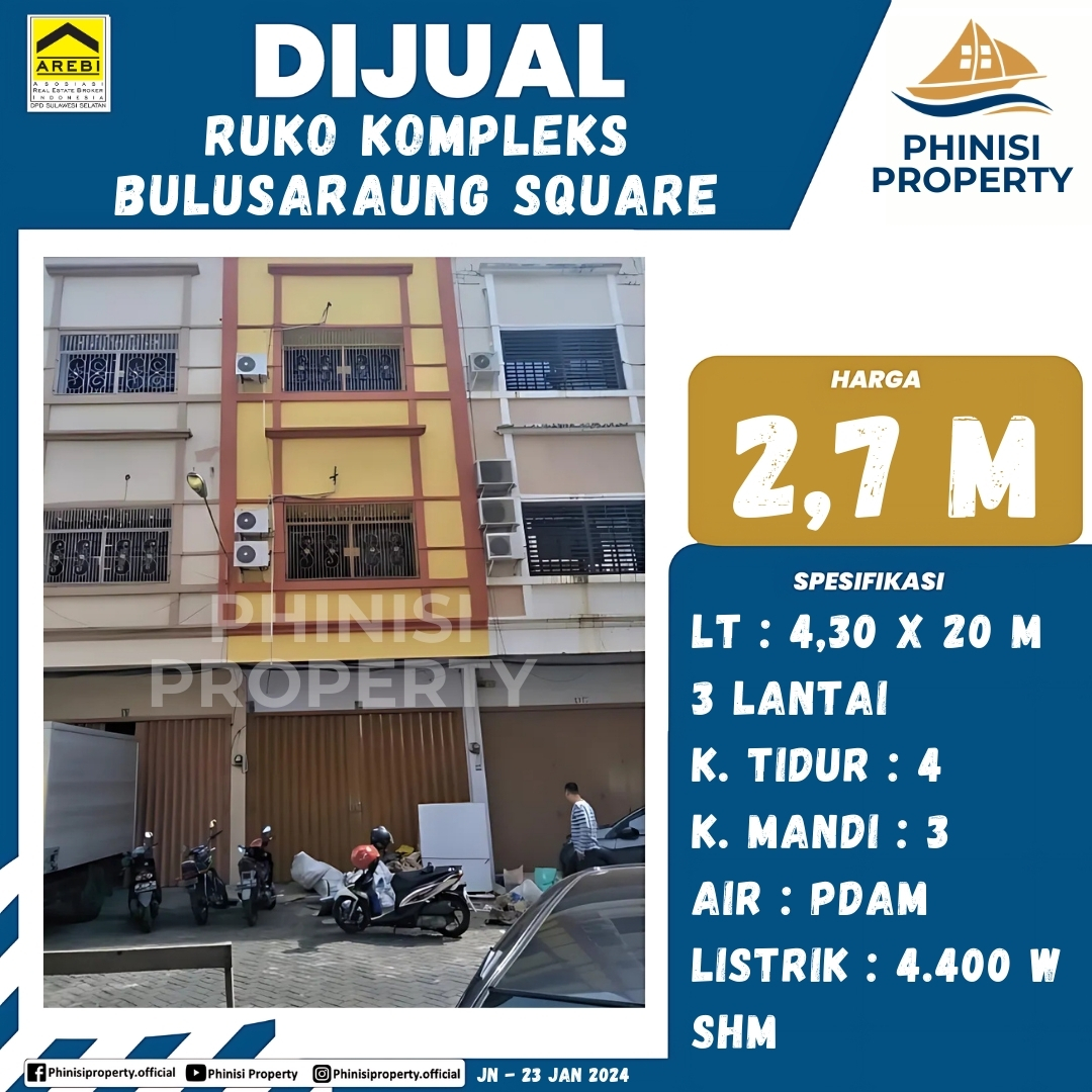 Ruko yang berlokasi di Kompleks Bulusaraung Square ini sangat ideal untuk berbagai jenis usaha. Memiliki luas tanah 86 meter persegi (4,30 m x 20 m) dan tiga lantai, ruko ini menawarkan ruang yang cukup luas dan fungsional. Properti ini memiliki empat kamar tidur dan tiga kamar mandi. Dilengkapi dengan air PDAM, daya listrik 4.400 Watt, serta sertifikat SHM, ruko ini menjamin kenyamanan dan keamanan bagi pembeli.