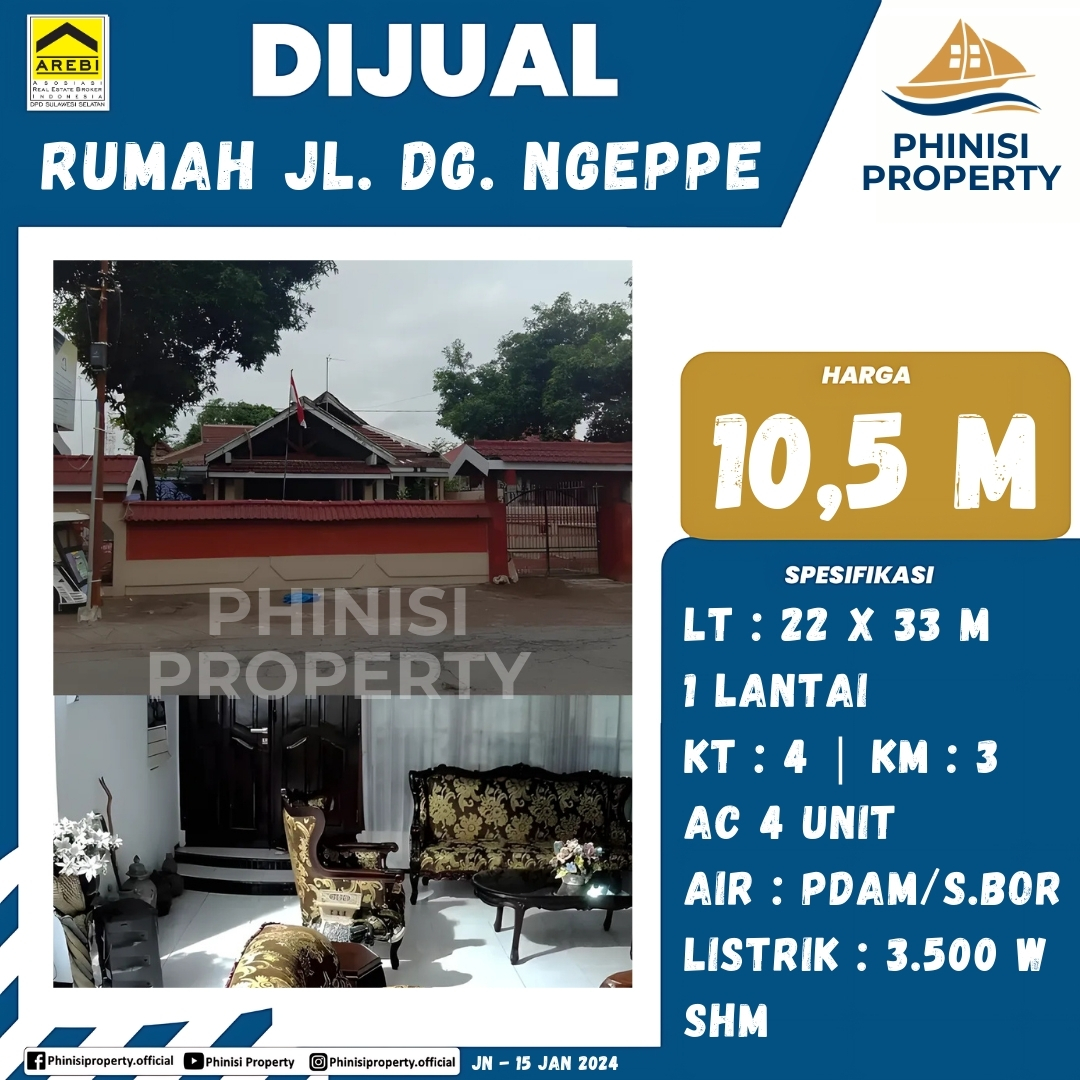 Rumah besar dan fungsional ini berlokasi di Jalan Dg. Ngeppe, ideal untuk keluarga besar atau untuk investasi. Properti ini memiliki luas tanah 726 meter persegi (22 m x 33 m) dengan satu lantai yang fungsional. Terdapat empat kamar tidur, tiga kamar mandi, dan empat unit AC. Rumah ini juga dilengkapi dengan daya listrik 3.500 Watt dan pasokan air dari PDAM/sumur bor, serta sudah bersertifikat SHM, menjamin kepastian hukum bagi pembeli.