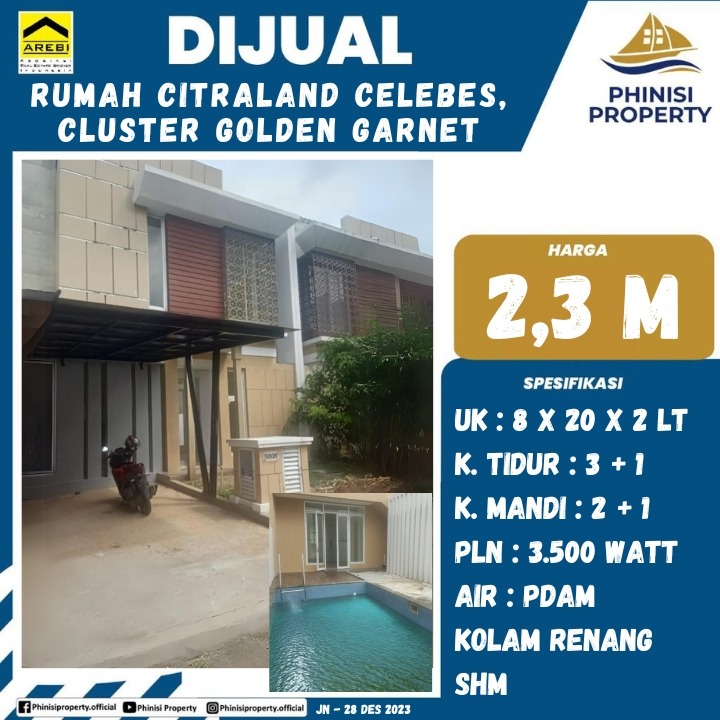 Properti modern di Citraland Celebes, Cluster Golden Garnet ini ideal untuk hunian keluarga yang mencari kenyamanan dan fasilitas lengkap. Rumah ini memiliki luas bangunan 320 meter persegi (8 m x 20 m x 2 lantai), terdiri dari tiga kamar tidur utama dan satu kamar tidur tambahan, serta dua kamar mandi utama dan satu kamar mandi tambahan. Dilengkapi dengan kolam renang, listrik 3.500 Watt, air PDAM, dan sertifikat SHM, rumah ini menawarkan gaya hidup mewah dan praktis.