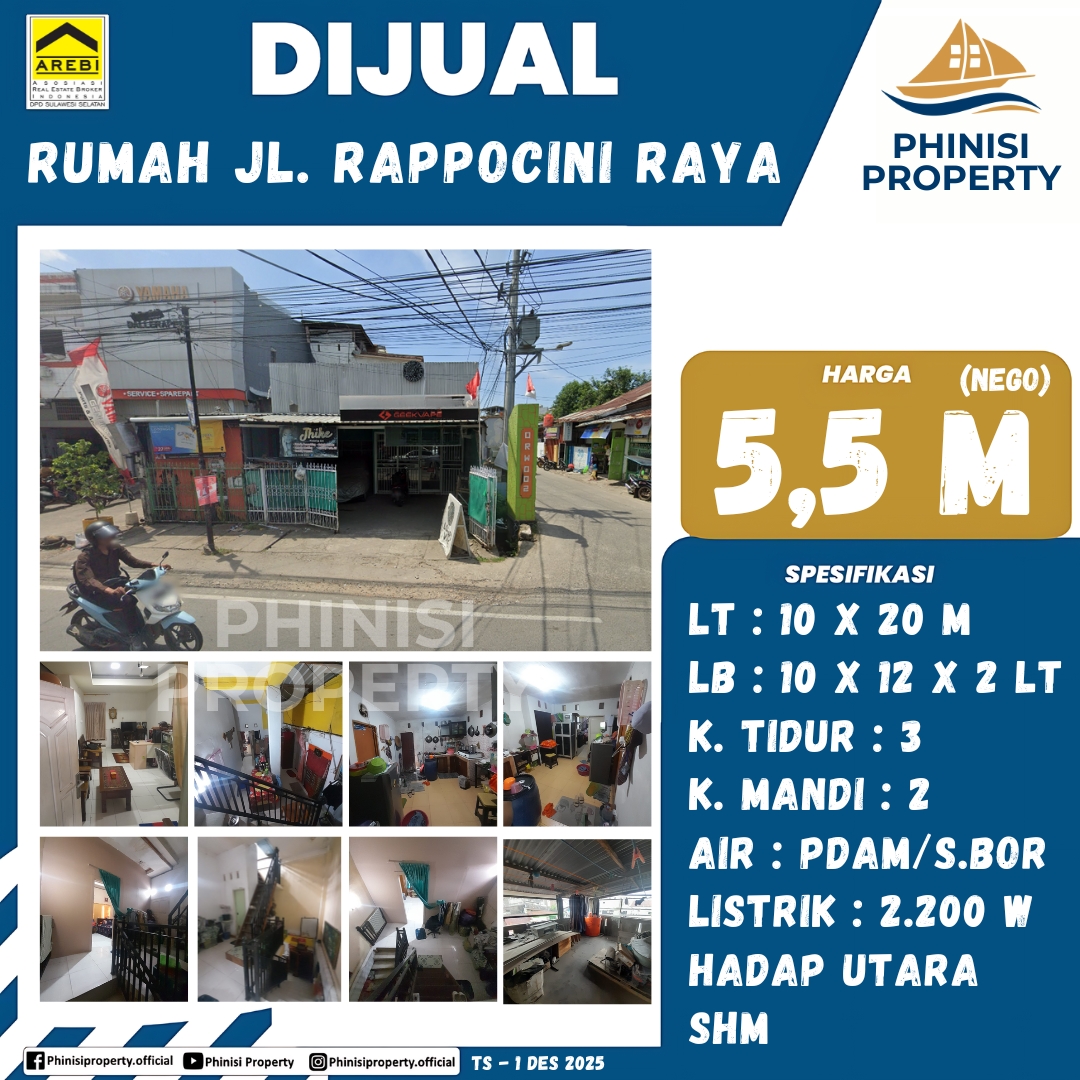 Dapatkan kesempatan langka memiliki aset properti potensial yang berlokasi tepat di jalan poros utama melalui penawaran rumah dua lantai di Jalan Rappocini Raya ini. Berdiri di atas lahan luas berukuran 10 x 20 meter dengan legalitas SHM, properti yang menghadap ke Utara ini sangat ideal untuk difungsikan sebagai hunian keluarga maupun tempat usaha komersial karena letaknya yang strategis dan ramai. Bangunan ini telah didukung dengan fasilitas yang siap pakai, meliputi 3 kamar tidur, 2 kamar mandi, daya listrik 2.200 Watt, serta fleksibilitas sumber air dari PDAM dan sumur bor, menjadikannya pilihan investasi cerdas bagi Anda yang mencari properti serbaguna di pusat kota Makassar.