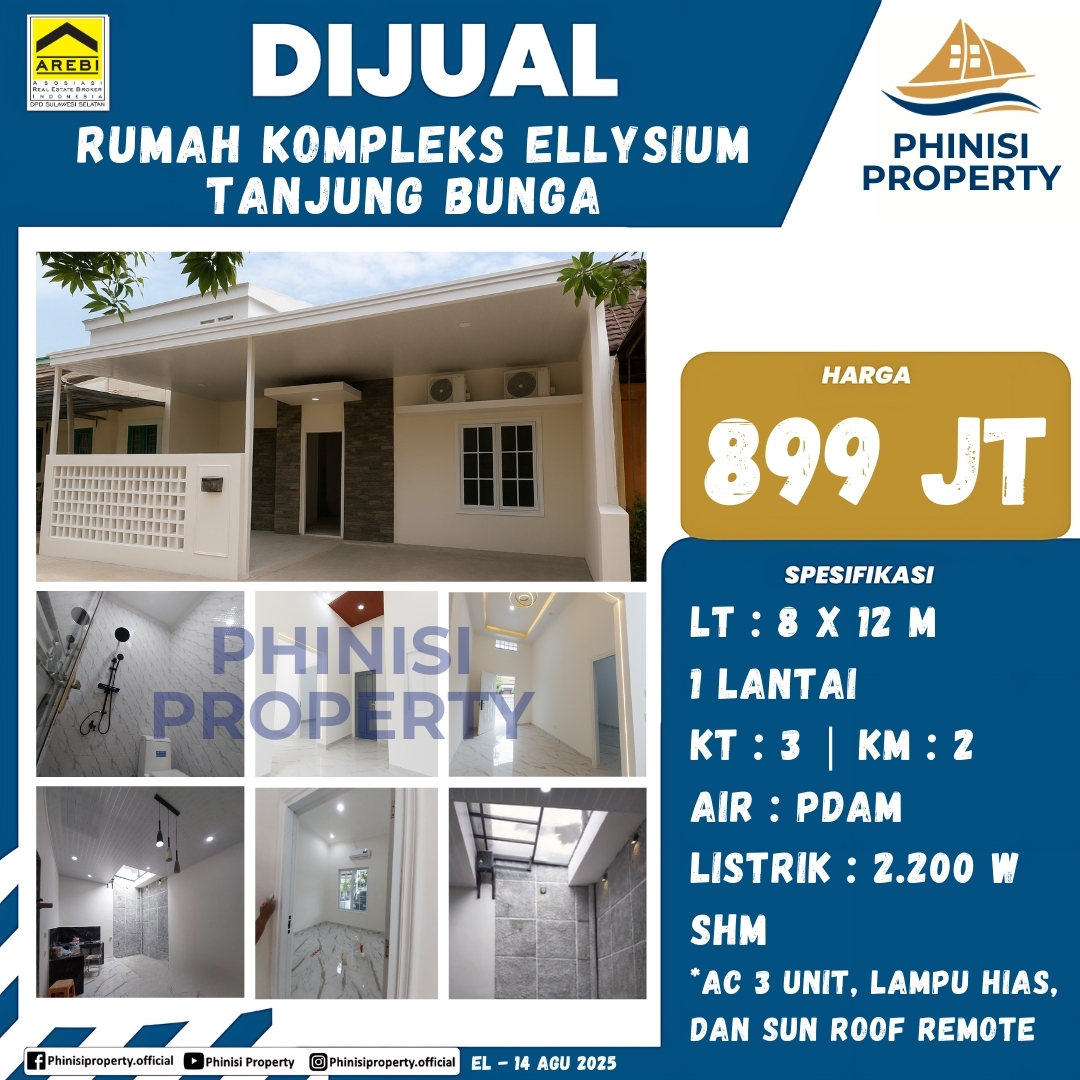 Rumah dijual di Kompleks Elysium, Tanjung Bunga, Makassar ini adalah pilihan hunian yang sangat menarik. Berada di salah satu kawasan paling strategis, rumah satu lantai ini memiliki luas tanah 8 x 12 meter atau 96 m², serta dilengkapi dengan 3 kamar tidur dan 2 kamar mandi. Fasilitas air PDAM dan daya listrik 2.200 watt sudah tersedia, dan legalitasnya pun terjamin dengan Sertifikat Hak Milik (SHM). Properti ini juga dijual beserta beberapa bonus, yaitu 3 unit AC, lampu hias, dan remote sun roof, menjadikannya siap huni tanpa perlu renovasi. Dengan lokasi di Tanjung Bunga, properti ini adalah investasi yang sangat menjanjikan.
