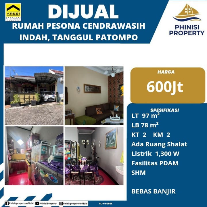 Rumah dijual di Perumahan Pesona Cendrawasih Indah, Tanggul Patompo, adalah pilihan hunian yang nyaman dan bebas banjir. Dengan luas tanah 97 m² dan luas bangunan 78 m², rumah ini sangat ideal untuk keluarga. Rumah ini memiliki 2 kamar tidur dan 2 kamar mandi, serta dilengkapi dengan ruang salat, memberikan kenyamanan ekstra bagi penghuninya. Fasilitas air PDAM dan daya listrik 1.300 watt sudah tersedia, dan legalitasnya pun terjamin dengan Sertifikat Hak Milik (SHM). Properti ini ditawarkan dengan harga yang sangat kompetitif dan menjanjikan, menjadikannya kesempatan yang tidak boleh dilewatkan.