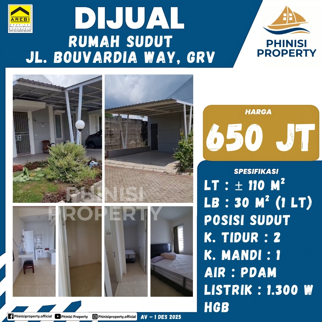 Manfaatkan peluang memiliki rumah dengan posisi strategis di hook atau sudut di Jalan Bouvardia Way, kawasan GRV. Rumah satu lantai ini berdiri di atas lahan yang cukup luas, sekitar 110 meter persegi, menawarkan keleluasaan tambahan di area terbuka. Dengan luas bangunan 30 meter persegi, properti ini memiliki desain minimalis yang efisien, dilengkapi dengan 2 kamar tidur dan 1 kamar mandi. Kenyamanan hunian didukung oleh pasokan air PDAM dan daya listrik 1.300 Watt, dengan status legalitas HGB yang aman. Properti sudut ini sangat ideal bagi pembeli rumah pertama atau sebagai investasi yang mengutamakan lokasi dan potensi pengembangan lahan di masa depan.