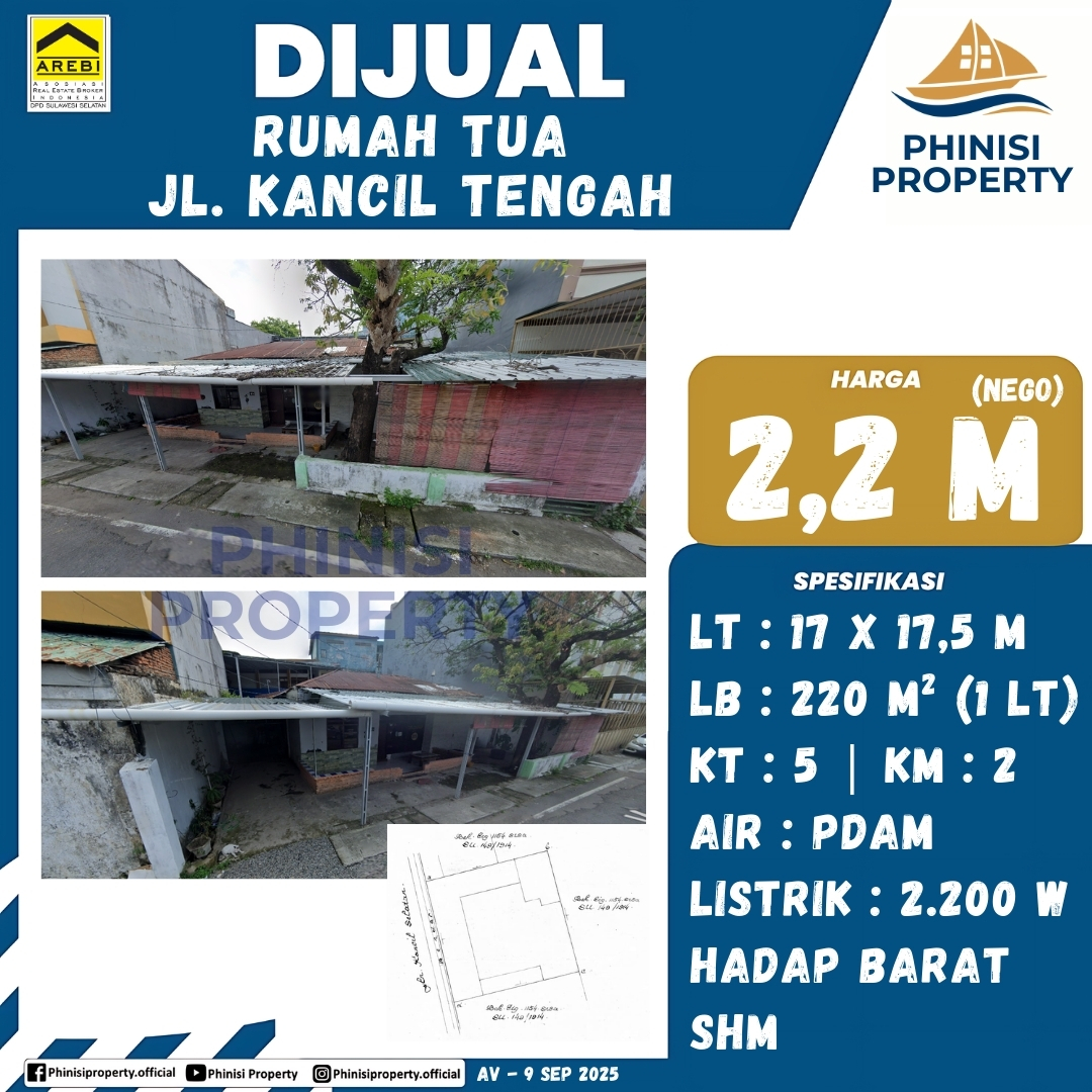 Miliki segera rumah tua di Jalan Kancil Tengah. Properti ini sangat cocok untuk Anda yang mencari lokasi strategis untuk investasi atau pembangunan ulang. Dengan luas tanah 297,5 meter persegi (17 x 17,5 meter) dan luas bangunan 220 meter persegi, rumah satu lantai ini memiliki lima kamar tidur dan dua kamar mandi. Posisinya yang menghadap barat menawarkan potensi renovasi yang sangat menjanjikan. Jangan lewatkan kesempatan emas untuk memiliki properti di salah satu lokasi yang ramai dan strategis di kota Makassar.