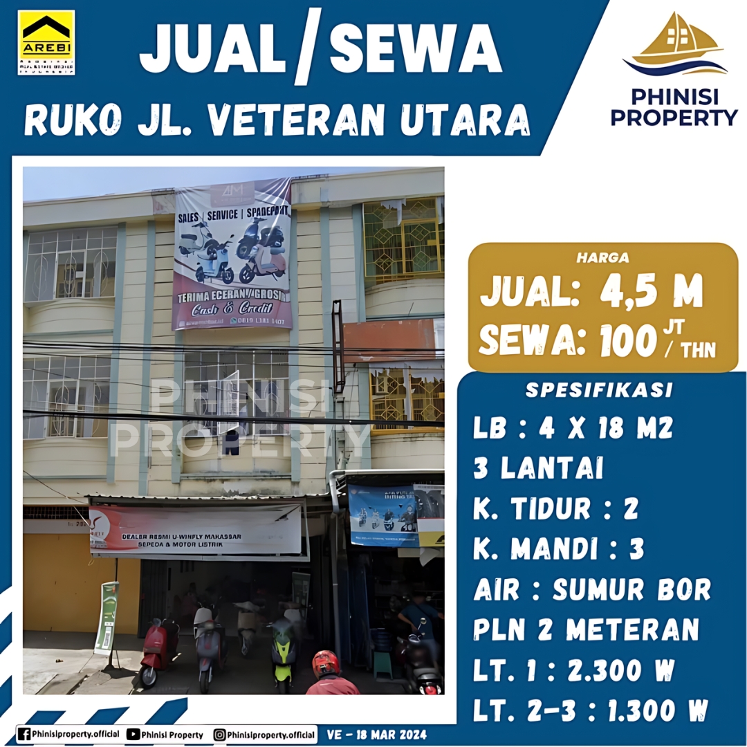 Temukan peluang bisnis menarik dengan ruko 3 lantai di Jl. Veteran Utara, Makassar! Properti ini tersedia untuk dijual seharga 4,5 Milyar atau disewakan dengan harga 100 Juta/tahun. Dengan luas bangunan (LB) 4x18 m², ruko ini memiliki 2 kamar tidur dan 3 kamar mandi, sangat cocok untuk berbagai jenis usaha atau kantor. Dilengkapi dengan air sumur bor dan dua meteran PLN (Lantai 1: 2.300 W, Lantai 2-3: 1.300 W), ruko ini siap untuk ditempati. Lokasi strategis di Makassar menjamin aksesibilitas dan visibilitas yang baik. Hubungi Phinisi Property sekarang untuk informasi lebih lanjut dan jadwalkan kunjungan Anda.