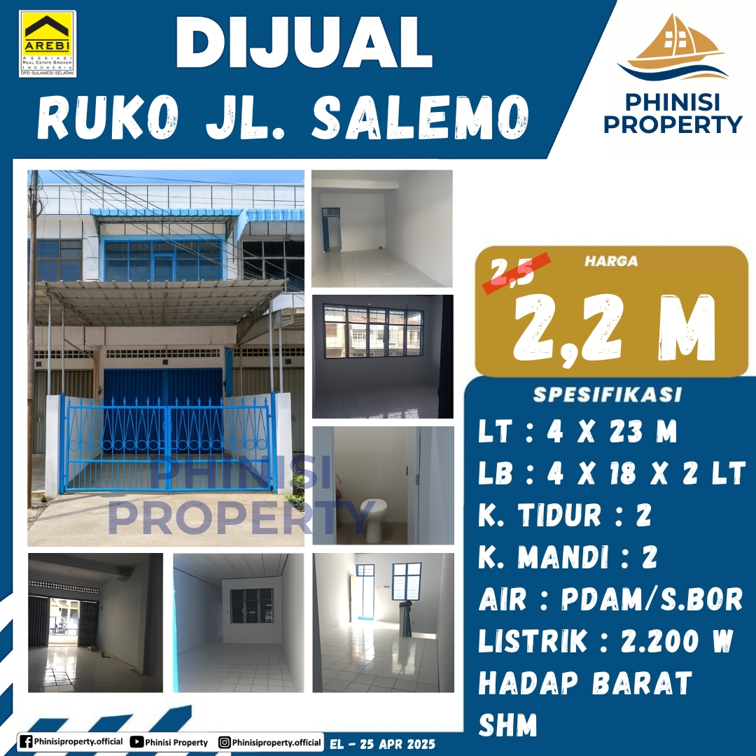 Mencari properti komersial yang fleksibel di Makassar? Ruko di Jalan Salemo bisa jadi pilihan yang sangat menguntungkan. Ruko ini memiliki luas tanah 4 x 23 meter dengan luas bangunan 4 x 18 meter, terdiri dari 2 lantai. Dilengkapi dengan 2 kamar tidur dan 2 kamar mandi, ruko ini menghadap ke Barat. Selain itu, properti ini memiliki fasilitas air PDAM/sumur bor, serta daya listrik 2.200 watt. Dengan Sertifikat Hak Milik (SHM), ruko ini sangat ideal untuk berbagai jenis usaha dan dapat dijual atau disewakan.