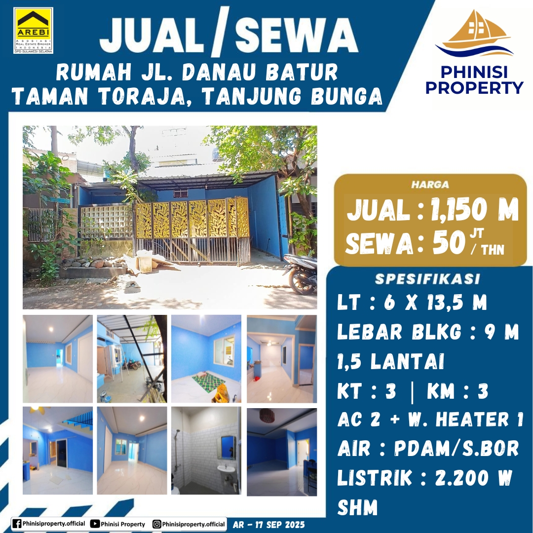 Temukan properti serbaguna untuk dijual atau disewa di Jalan Danau Batur, Taman Toraja, Tanjung Bunga. Rumah ini memiliki luas tanah 6×13,5 meter, dengan total luas 81 meter persegi. Bagian belakangnya memiliki lebar 9 meter. Bangunan terdiri dari 1,5 lantai dan dilengkapi dengan 3 kamar tidur, 3 kamar mandi, serta 2 unit AC dan 1 water heater. Fasilitas air tersedia dari PDAM dan sumur bor, sementara daya listriknya sebesar 2.200 watt. Properti ini memiliki legalitas Sertifikat Hak Milik (SHM).