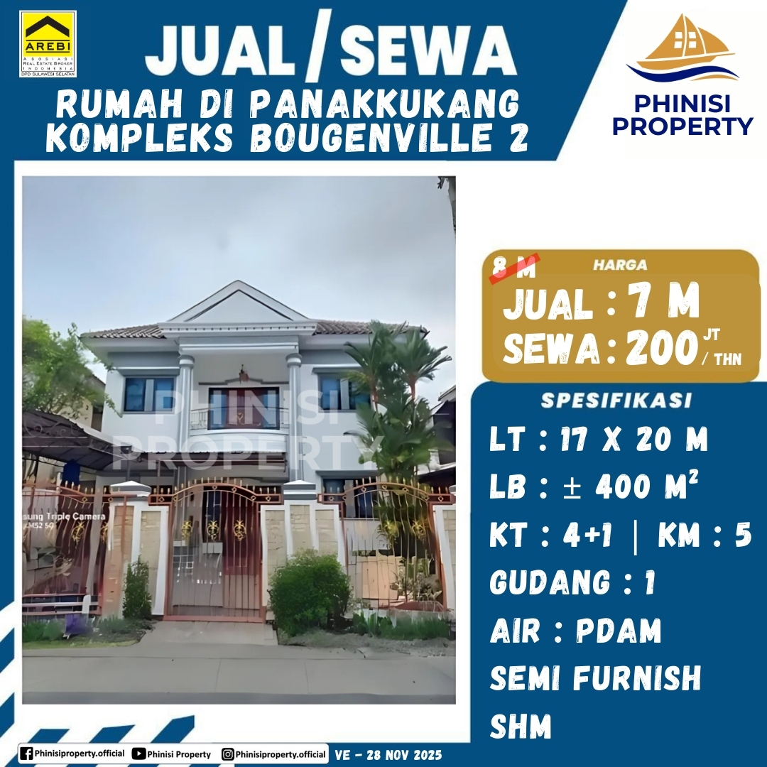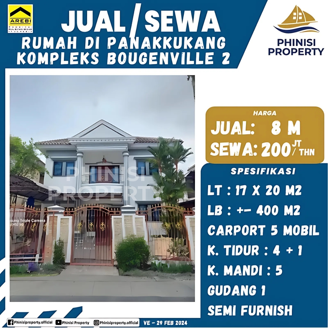 Miliki atau sewa rumah mewah di Kompleks Bougenville 2, Panakkukang, Makassar. Properti eksklusif ini ditawarkan untuk dijual seharga 8 Milyar atau disewakan 200 Juta/tahun. Dengan luas tanah (LT) 17x20 m² dan luas bangunan (LB) sekitar 400 m², rumah ini dilengkapi dengan carport untuk 5 mobil, 4+1 kamar tidur, 5 kamar mandi, dan 1 gudang. Properti ini juga semi furnished, siap huni. Lokasi strategis di Panakkukang menjadikan investasi ini sangat menjanjikan. Segera hubungi Phinisi Property untuk detail lebih lanjut dan jadwalkan kunjungan Anda.