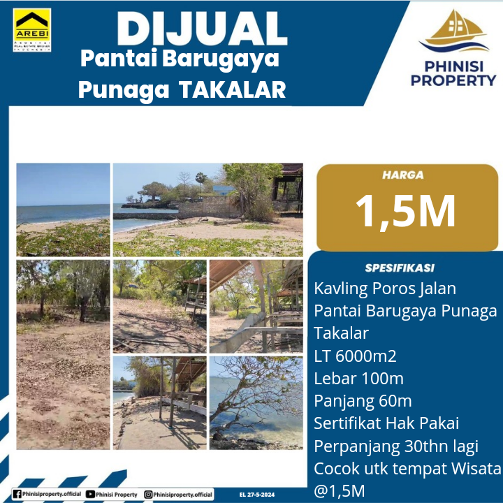 Kavling Tanah Pantai Barugaya Punaga, Takalar Letak kavling berada di poros jalan Takalar LT 6000m2 Lebar 100m Panjang 60m Sertifikat Hak Pakai Bisa perpanjang 30 tahun lagi Cocok buat Wisata Pantai dan Kuliner