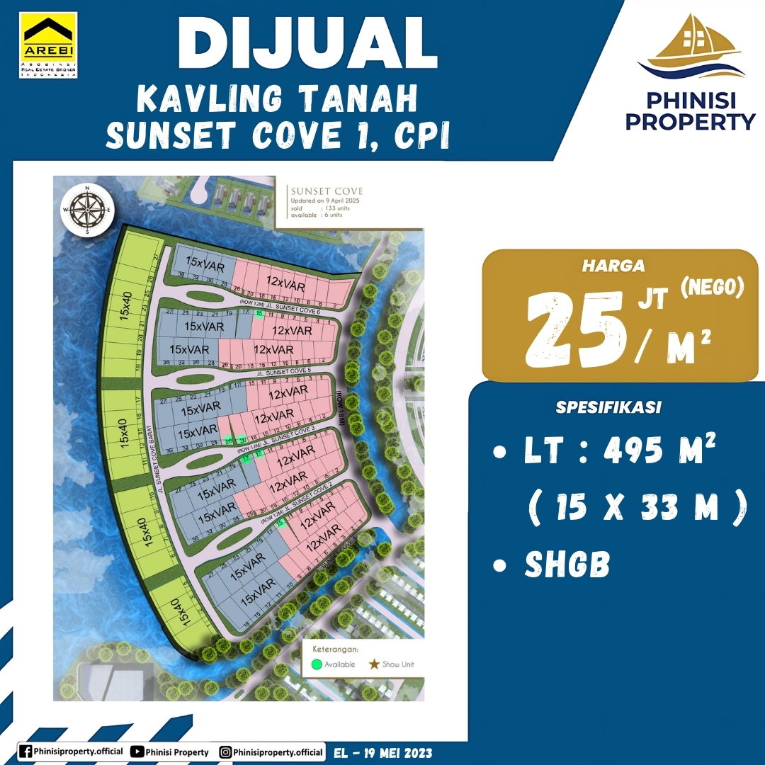 Kavling Sunset Cove 1, CPI Berhadapan dengan cluster Treasure Island Luas 495m2 (15×33) Sertifikat HGB @25Jt/m Total Rp12,375,000,000,-