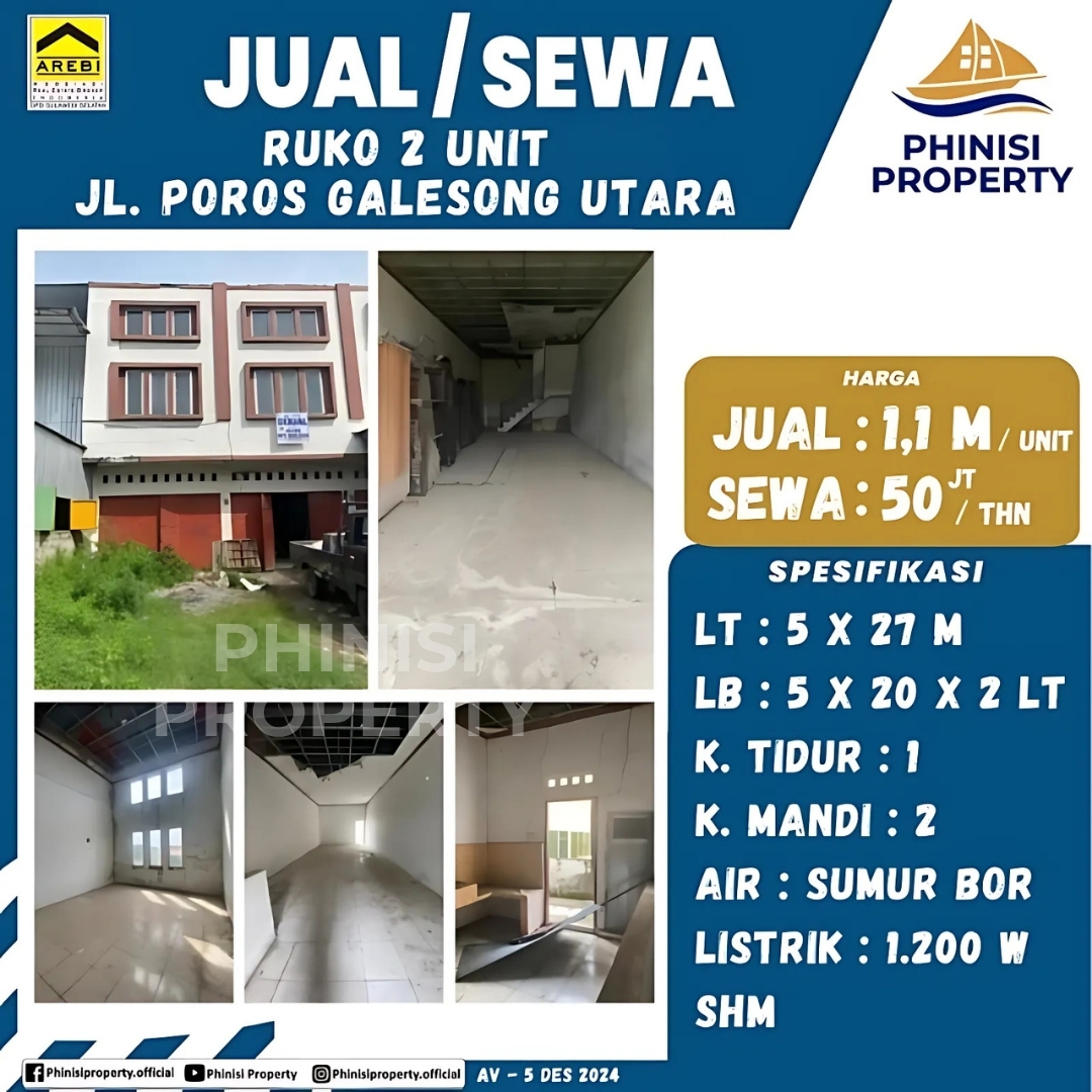 Ruko yang berlokasi di Jalan Poros Galesong Utara ini menawarkan peluang investasi properti yang sangat menjanjikan dengan lokasi yang strategis. Properti ini terdiri dari dua unit ruko dengan spesifikasi yang sangat menguntungkan, cocok untuk berbagai jenis usaha. Setiap unit memiliki luas lahan 5 x 27 meter dan bangunan dua lantai dengan luas 5 x 20 meter per lantai, memberikan ruang yang lapang dan fungsional. Ruko ini dilengkapi dengan satu kamar tidur dan dua kamar mandi, serta fasilitas dasar seperti pasokan air dari sumur bor dan daya listrik 1.200 watt. Dengan Sertifikat Hak Milik (SHM), kepemilikan properti ini terjamin keamanannya, menjadikannya pilihan yang ideal untuk pengembangan bisnis atau sebagai aset investasi jangka panjang.