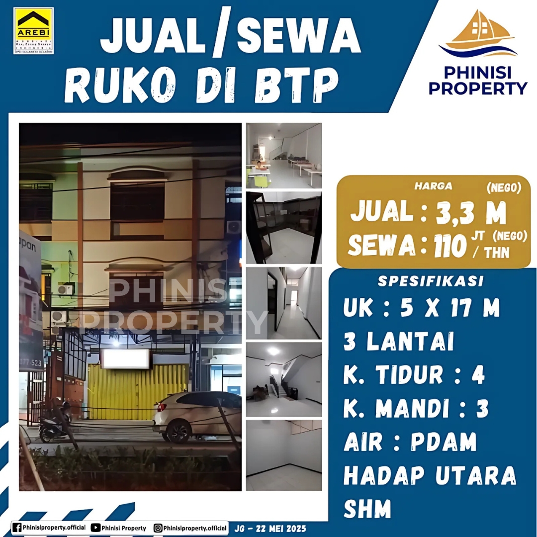 Ingin bisnis Anda berkembang di lokasi yang tepat? Ruko 3 lantai ini menawarkan segala yang Anda butuhkan untuk memulai atau memperluas usaha. Dengan luas bangunan 85 m², akses mudah, dan lingkungan yang ramai, properti ini adalah pilihan tepat untuk berbagai jenis usaha. Terdiri dari 4 kamar tidur dan 3 kamar mandi, serta sertifikat SHM yang menjamin keamanan investasi Anda. Tersedia untuk jual atau sewa, dan harga yang bisa dinegosiasikan. Jangan lewatkan kesempatan untuk memiliki atau menyewa ruko dengan potensi tinggi di BTP!