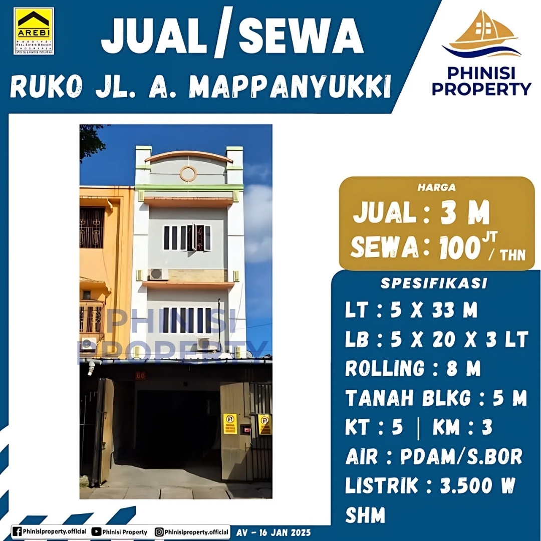 Berlokasi strategis di Jl. A. Mappanyukki, ruko tiga lantai ini menawarkan peluang investasi properti yang sangat menjanjikan. Dengan luas lahan 5 x 33 meter dan bangunan tiga lantai seluas 5 x 20 meter per lantai, ruko ini memberikan ruang yang sangat fungsional dan fleksibel untuk berbagai jenis usaha. Properti ini juga dilengkapi dengan area rolling sepanjang 8 meter dan sisa tanah belakang 5 meter, yang menambah nilai guna dan potensi pengembangan. Ruko ini memiliki lima kamar tidur dan tiga kamar mandi, menjadikannya sangat ideal untuk berbagai operasional bisnis. Fasilitas pendukung seperti pasokan air dari PDAM dan sumur bor, serta daya listrik 3.500 watt, sudah tersedia. Dengan sertifikat SHM (Sertifikat Hak Milik), properti ini menjamin legalitas yang aman dan merupakan aset yang sangat berharga.