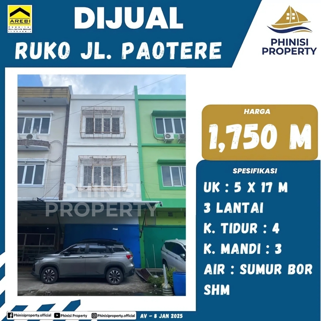 Ruko tiga lantai yang berlokasi strategis di Jl. Paotere ini adalah pilihan ideal untuk Anda yang mencari properti komersial dengan ruang yang luas dan fungsional. Dengan ukuran lahan 5 x 17 meter, ruko ini menawarkan banyak ruang untuk berbagai jenis usaha. Bangunan tiga lantainya dilengkapi dengan empat kamar tidur dan tiga kamar mandi, memberikan fleksibilitas tinggi untuk mengakomodasi kebutuhan bisnis Anda. Fasilitas dasar berupa pasokan air dari sumur bor sudah tersedia, memastikan kelancaran operasional. Dengan kepemilikan Sertifikat Hak Milik (SHM), properti ini menjamin legalitas yang aman dan merupakan investasi yang sangat menjanjikan di kawasan yang ramai.