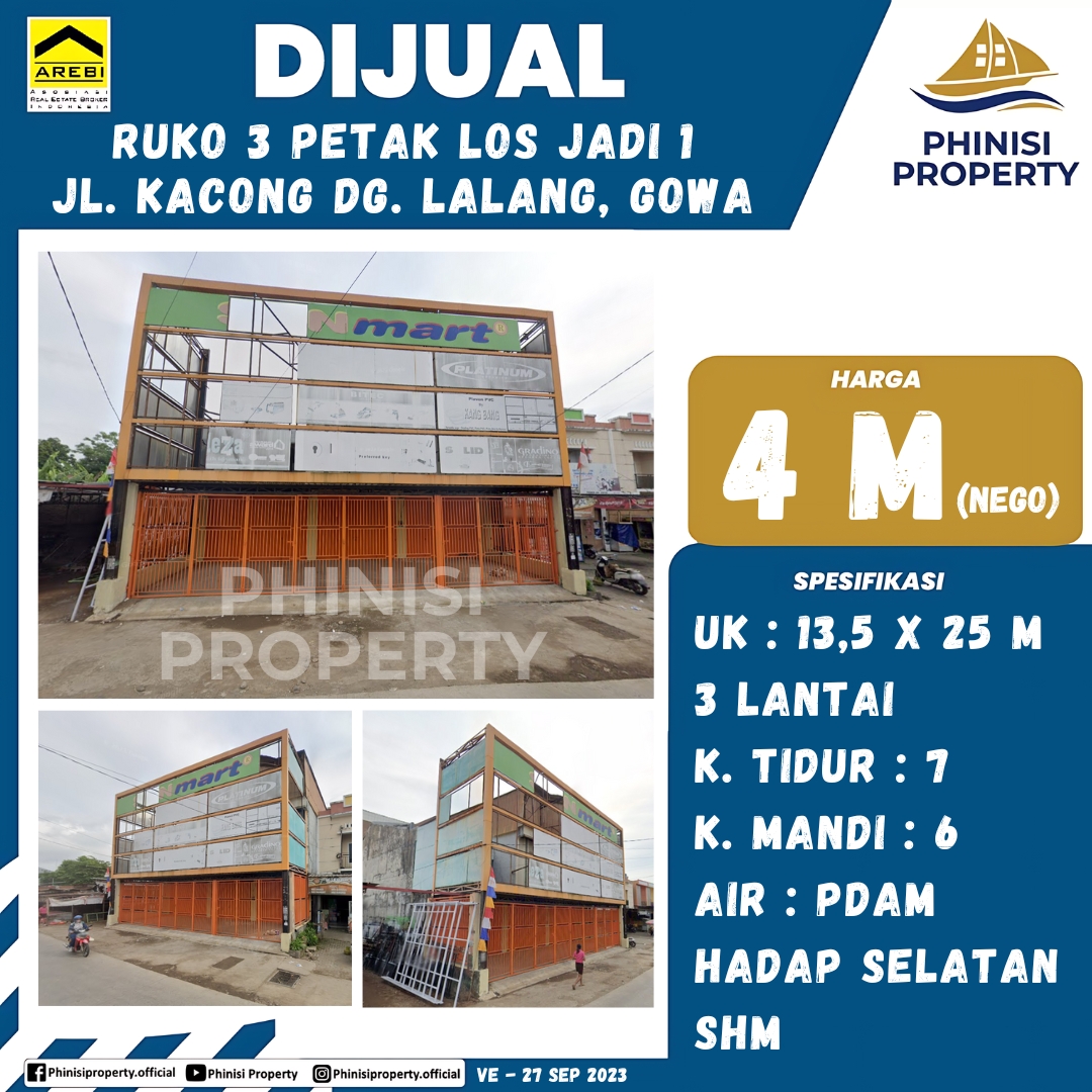PHINISI PROPERTY dengan bangga mempersembahkan properti komersial yang luar biasa: sebuah ruko megah yang terdiri dari 3 petak yang telah digabungkan menjadi 1 unit besar, berlokasi sangat strategis di Jl. Kacong Dg. Lalang, Gowa. Ini adalah kesempatan langka bagi investor besar atau pebisnis yang membutuhkan ruang luas dan premium untuk mengembangkan usaha di lokasi yang sangat prospektif!