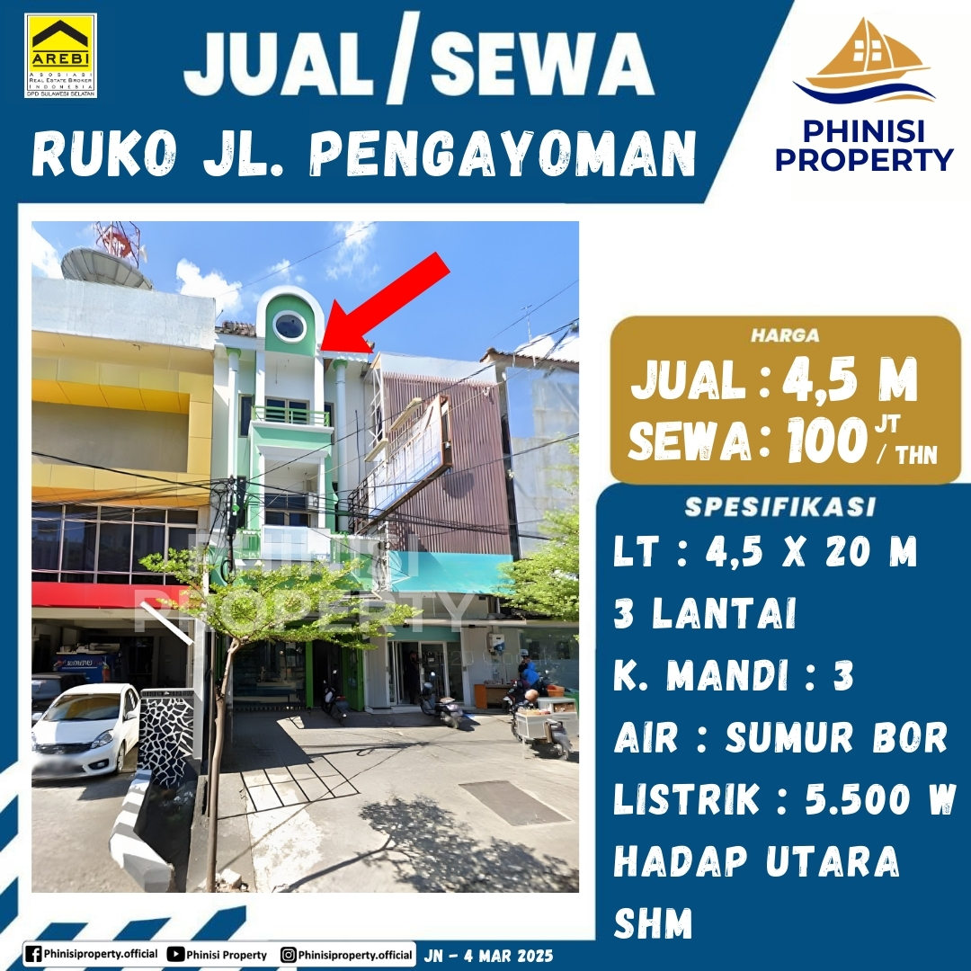 Ruko 3 lantai di Jalan Pengayoman ini menawarkan opsi jual atau sewa, menjadikannya pilihan investasi properti yang sangat menarik. Dengan luas tanah 90 meter persegi (4,5 x 20 M), properti ini menyediakan ruang yang luas dan fungsional. Ruko ini memiliki 3 kamar mandi, pasokan air dari sumur bor, dan daya listrik 5.500 W. Dengan posisi menghadap utara, ruko ini adalah pilihan yang ideal bagi para pebisnis yang mencari properti di area komersial.