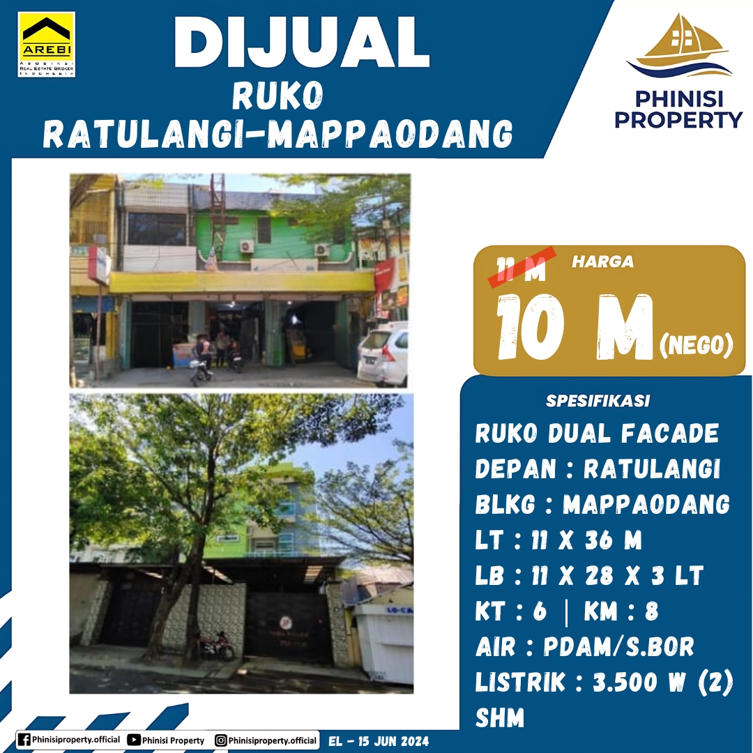 Ruko dual facade depan jl. Ratulangi belakang jl. Mappaodang LT 396m2 (11x36) LB 900m2 (11x28) Bangunan 3 lantai Hdp Timur (ratulangi) - Barat (mappaodang) KT 6 KM 8 PLN 3500W (2 meteran) AIR SUMUR BOR + PDAM Sertifikat SHM