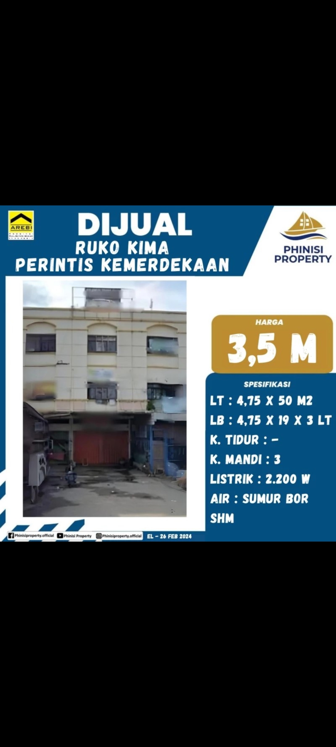 Ruko KIMA Poros jl Perintis Kemerdekaan LT 250 LB 275 SHM Parkiran luas Cocok kantor atau dagang