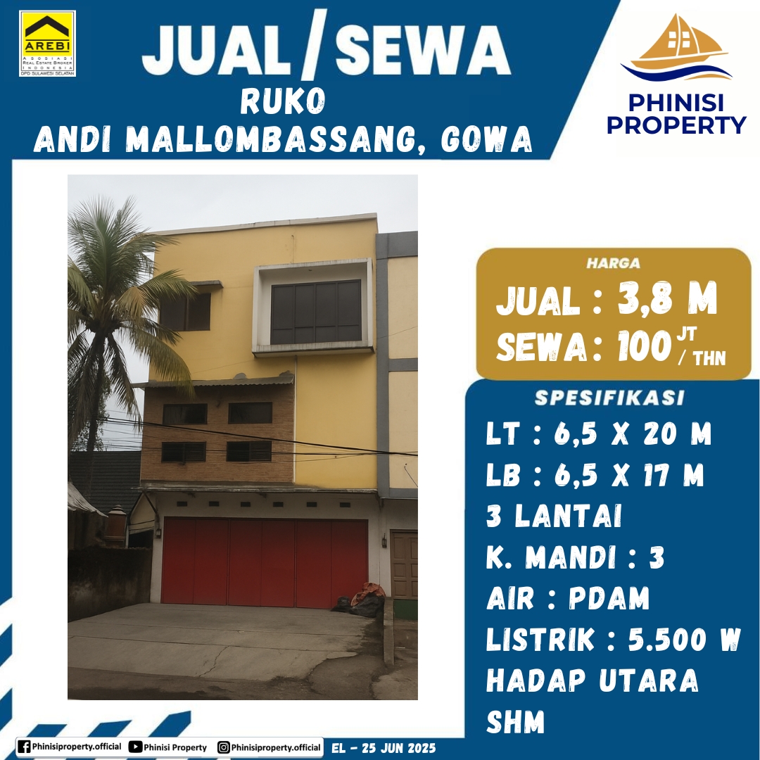 Ruko Lapang Andi Mallombassang, Gowa LT 130 LB 330 Terletak di jalan poros Area perkantoran dan perdagangan