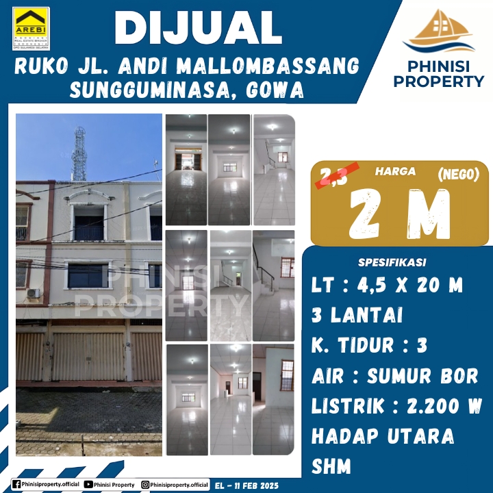 Ruko layak pakai Andi Mallombassang Gowa LT 112,5 LB 256,5 Tingkat 3 lantai Hadap Timur Laut SHM Akses poros jalan raya Mallombasang dekat ke Makassar Area perkantoran dan perdagangan Cocok segala usaha Harga Jual masih nego