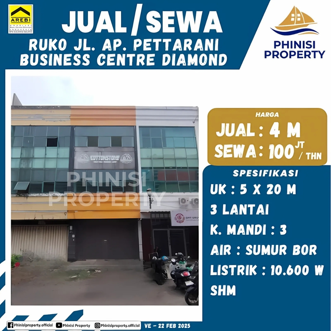 Ruko ini dilengkapi dengan 3 kamar mandi, pasokan air sumur bor, dan daya listrik besar 10.600 Watt, memastikan semua kebutuhan operasional bisnis Anda terpenuhi. Lokasinya yang sangat strategis di AP Pettarani Business Centre Diamond, berada di jantung kawasan bisnis dan komersial Makassar, menjamin visibilitas maksimal, aksesibilitas tinggi, dan potensi pasar yang besar.