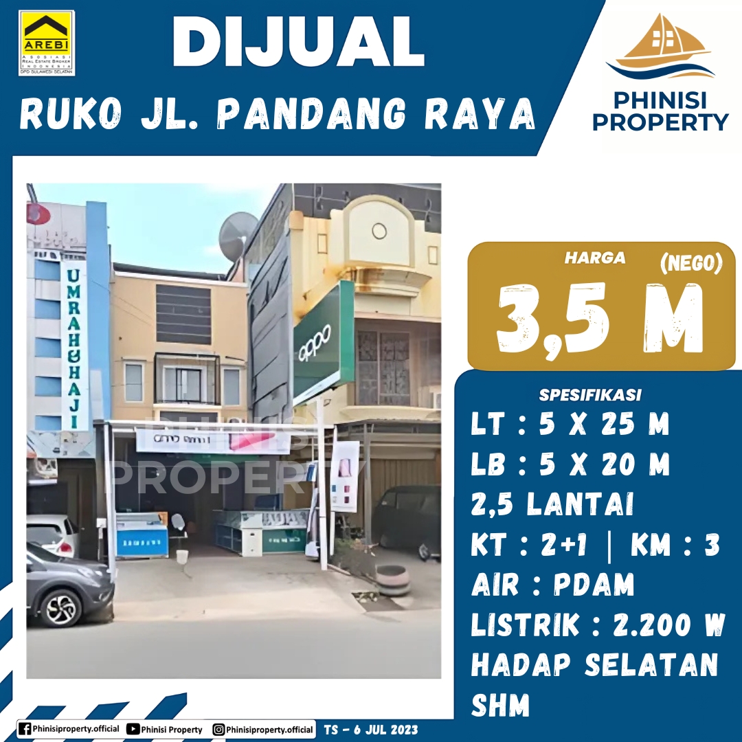 Mencari properti komersial yang ideal untuk bisnis Anda? Ruko yang satu ini terletak di Jalan Pandang Raya, Makassar, sebuah area yang ramai dan strategis. Dengan luas tanah 125 m² (5 m x 25 m) dan luas bangunan 100 m² (5 m x 20 m), ruko 2,5 lantai ini menawarkan ruang yang fungsional untuk berbagai jenis usaha. Dilengkapi dengan 2 kamar tidur 1 dan 3 kamar mandi, ruko ini juga dapat difungsikan sebagai tempat tinggal. Fasilitas pendukung seperti air PDAM dan listrik 2.200 W menjamin kenyamanan operasional. Menghadap ke selatan dan berstatus Sertifikat Hak Milik (SHM), properti ini memberikan kepastian dan keamanan investasi properti jangka panjang.