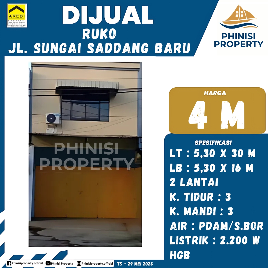 Mencari properti komersial yang menjanjikan? Ruko ini berlokasi strategis di kawasan Sungai Saddang Baru, Makassar. Dengan luas tanah 159 m² (5,3 m x 30 m) dan luas bangunan 84,8 m² (5,3 m x 16 m), ruko ini menawarkan ruang yang fungsional untuk berbagai jenis usaha. Dilengkapi dengan 3 kamar tidur dan 3 kamar mandi, ruko ini juga dapat difungsikan sebagai tempat tinggal. Fasilitas pendukung seperti listrik 2.200 W dan pasokan air PDAM/S.bor menjamin kenyamanan operasional. Dengan status Hak Guna Bangunan (HGB), properti ini adalah pilihan investasi properti yang sangat menarik.