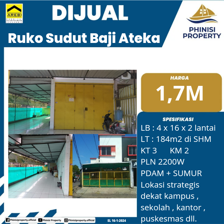 Ruko Sudut Jl. Baji Ateka Cocok dagang Akses Cendrawasih dan Mappaodang LT 184 LB 128 SHM