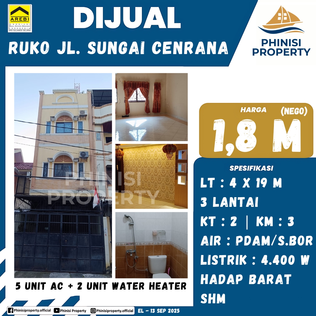 Ruko Jl. Sungai Cendrana Ukr. Lbr 4 x pjg 19 (LT 79 m² / LB 166 m²) 3 lantai Hadap barat Kmr tdr 2 . Kmr mandi 3 Pln 4400 w Air PDAM dan Air Sumur, 5 Unit AC, dan 2 Unit Water Heater, Sertifikat SHM Harga Jual Rp 1,8M (Nego) Cocok kantor dan hunian.