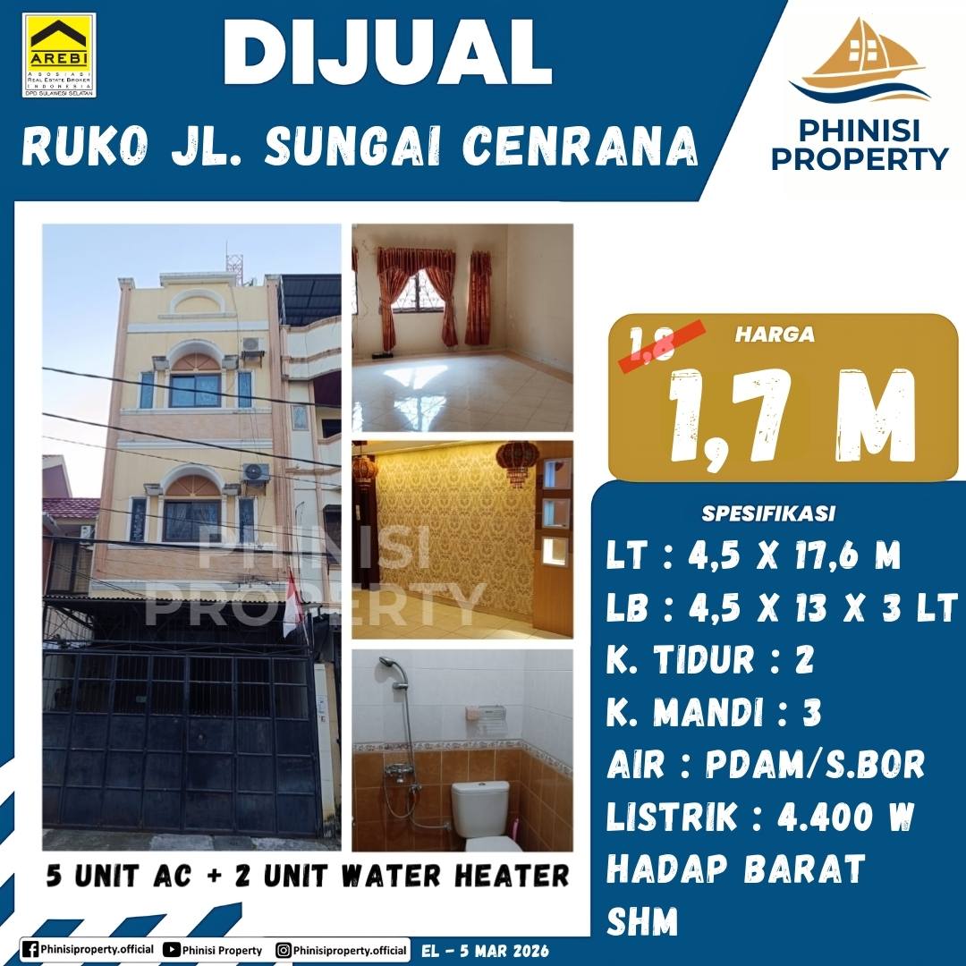Ruko Jl. Sungai Cendrana Ukr. Lbr 4,5 x pjg 17,6 (LT 79,2 m² / LB 175,5 m²) 3 lantai Hadap barat Kmr tdr 2 . Kmr mandi 3 Pln 4400 w Air PDAM dan Air Sumur, 5 Unit AC, dan 2 Unit Water Heater, Sertifikat SHM Cocok kantor dan hunian.