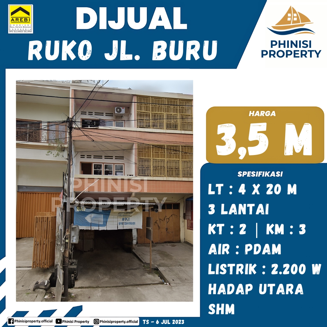 Cari properti komersial yang strategis untuk bisnis Anda? Ruko yang satu ini terletak di Jalan Buru, Makassar, area yang hidup dan ramai. Dengan luas tanah 80 m² (4 m x 20 m), ruko tiga lantai ini menawarkan ruang yang fungsional untuk berbagai jenis usaha. Dilengkapi dengan 2 kamar tidur dan 3 kamar mandi, ruko ini juga dapat difungsikan sebagai tempat tinggal. Ketersediaan air PDAM dan listrik 2.200 W menjamin kenyamanan operasional. Menghadap ke utara, properti ini memiliki sirkulasi udara dan cahaya yang optimal, dan dengan status Sertifikat Hak Milik (SHM), ruko ini memberikan kepastian dan keamanan investasi properti.