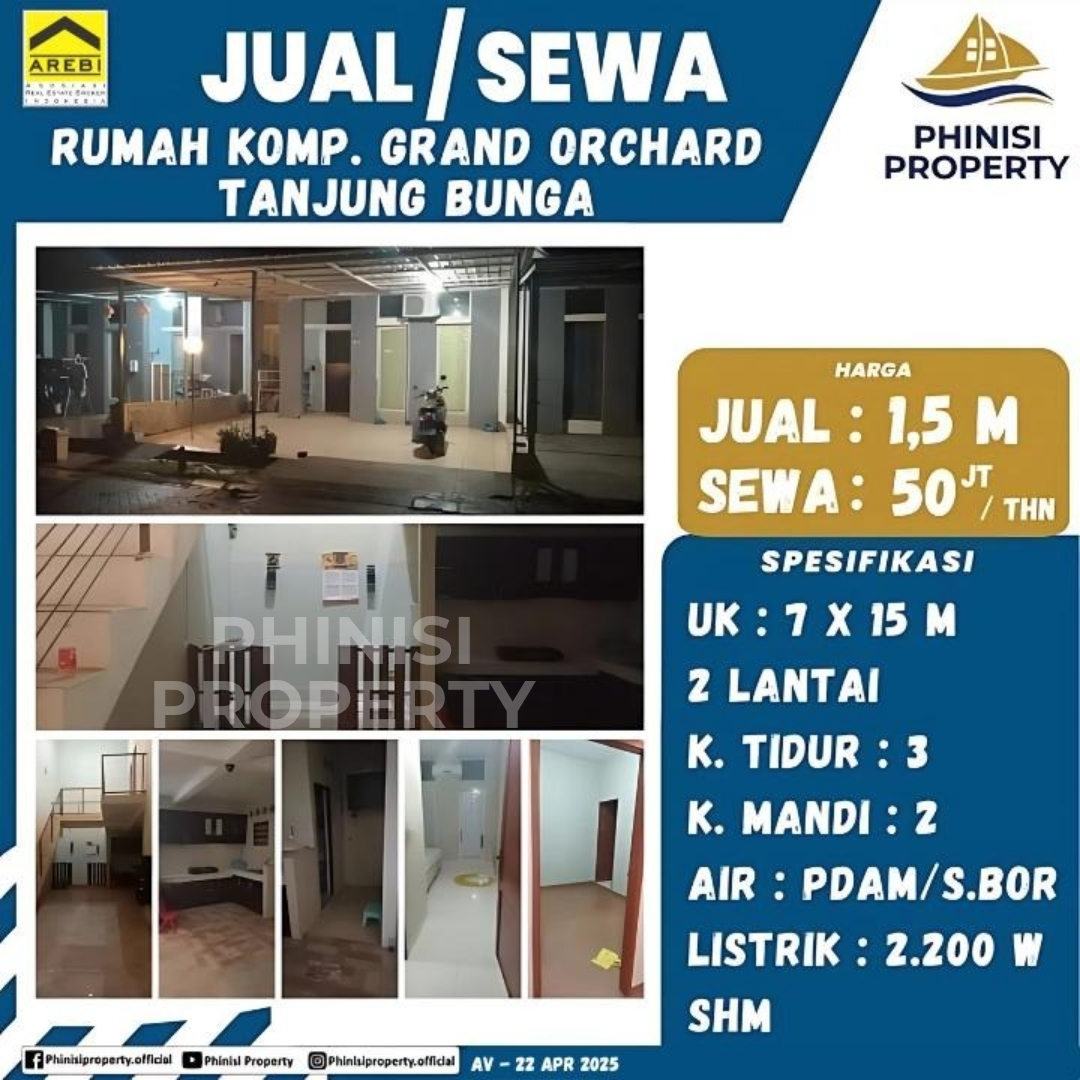 Rumah yang berlokasi di Kompleks Grand Orchard, kawasan prestisius Tanjung Bunga, ini adalah pilihan hunian yang ideal bagi Anda yang mencari rumah dengan lingkungan nyaman. Dengan luas lahan 7 x 15 meter, rumah dua lantai ini menawarkan ruang yang efisien dan fungsional. Properti ini dilengkapi dengan tiga kamar tidur dan dua kamar mandi, sangat cocok untuk keluarga kecil. Fasilitas dasar seperti pasokan air dari PDAM dan sumur bor, serta daya listrik 2.200 watt juga sudah tersedia, memastikan kenyamanan harian. Dengan sertifikat Hak Milik (SHM) yang menjamin legalitas, rumah ini tidak hanya menawarkan tempat tinggal yang nyaman, tetapi juga merupakan investasi properti yang solid.