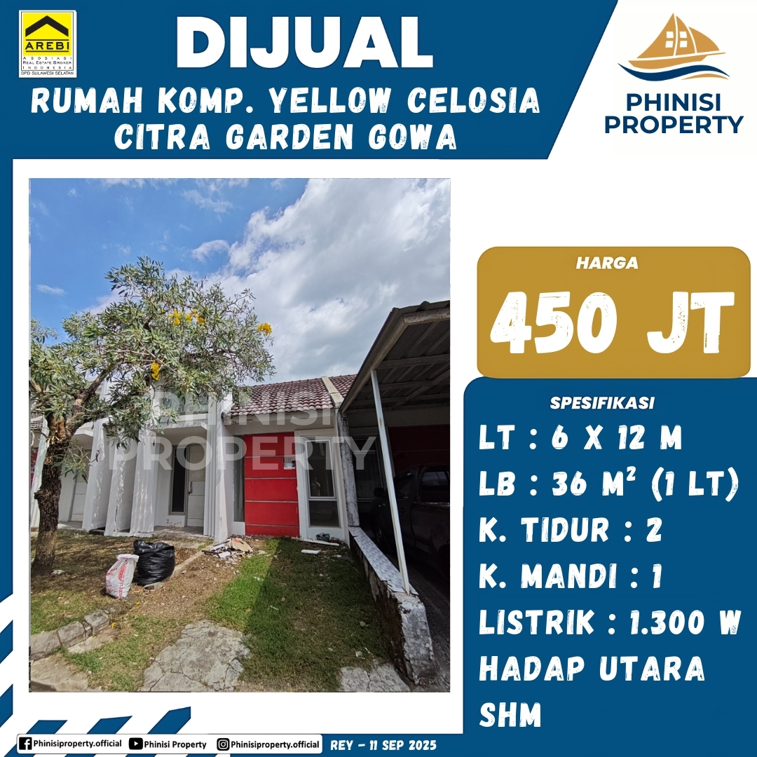 Mencari hunian minimalis yang nyaman dan strategis? Rumah yang satu ini terletak di Kompleks Yellow Celosia, Citra Garden Gowa. Dengan luas tanah 72 m² (6 m x 12 m) dan luas bangunan 36 m², rumah satu lantai ini menawarkan ruang yang fungsional dan ideal untuk tempat tinggal. Dilengkapi dengan 2 kamar tidur dan 1 kamar mandi, rumah ini cocok untuk pasangan muda atau keluarga kecil. Dengan daya listrik 1.300 W, rumah ini siap dihuni. Menghadap ke utara dan berstatus Sertifikat Hak Milik (SHM), properti ini menawarkan kepastian dan keamanan investasi properti jangka panjang.