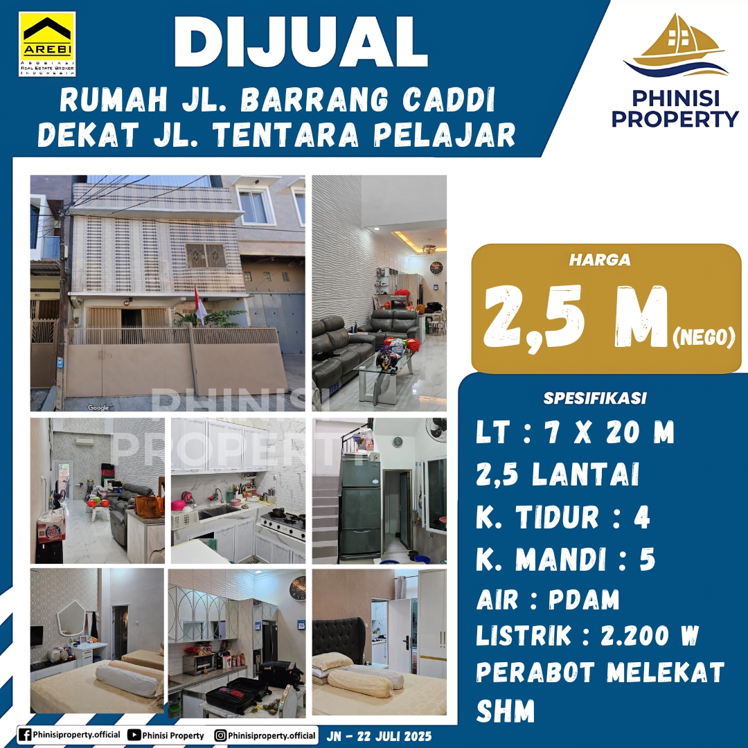 Rumah 2,5 lantai ini berlokasi di Jalan Barang Caddi, dekat dengan Jalan Tentara Pelajar, menawarkan hunian ideal untuk keluarga. Berdiri di atas lahan seluas 140 meter persegi (7 x 20 M), rumah ini memiliki tata letak yang fungsional. Properti ini memiliki 4 kamar tidur dan 5 kamar mandi, dilengkapi dengan perabot melekat, pasokan air PDAM, dan daya listrik 2.200 W. Lokasi yang strategis ini menjadikan properti ini pilihan yang sempurna bagi mereka yang mencari hunian nyaman dan modern.