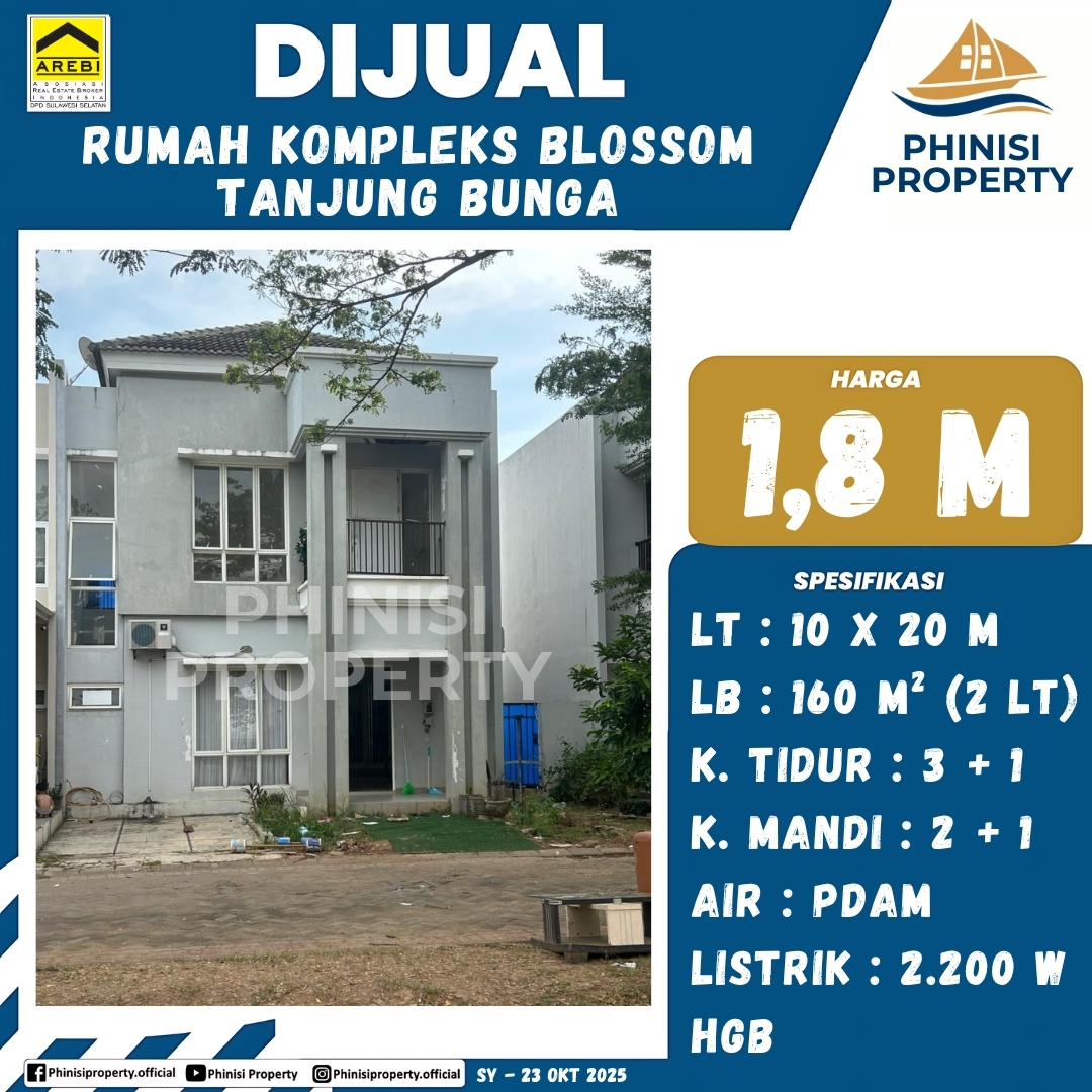 Dijual rumah cantik dua lantai (2 LT) di Kompleks Blossom, kawasan eksklusif Tanjung Bunga, menawarkan hunian modern di lingkungan premium. Properti ini memiliki spesifikasi yang luas untuk kenyamanan keluarga, dengan luas tanah (LT) 10 x 20 meter dan luas bangunan (LB) 160 meter persegi. Rumah ini dilengkapi dengan 3 + 1 kamar tidur dan 2 + 1 kamar mandi. Untuk fasilitas penunjang, sudah tersedia sambungan air PDAM dan daya listrik 2.200 Watt. Status kepemilikan properti ini adalah Hak Guna Bangunan (HGB) yang jelas. Kesempatan emas untuk memiliki rumah impian di salah satu kompleks perumahan paling dicari dengan fasilitas yang