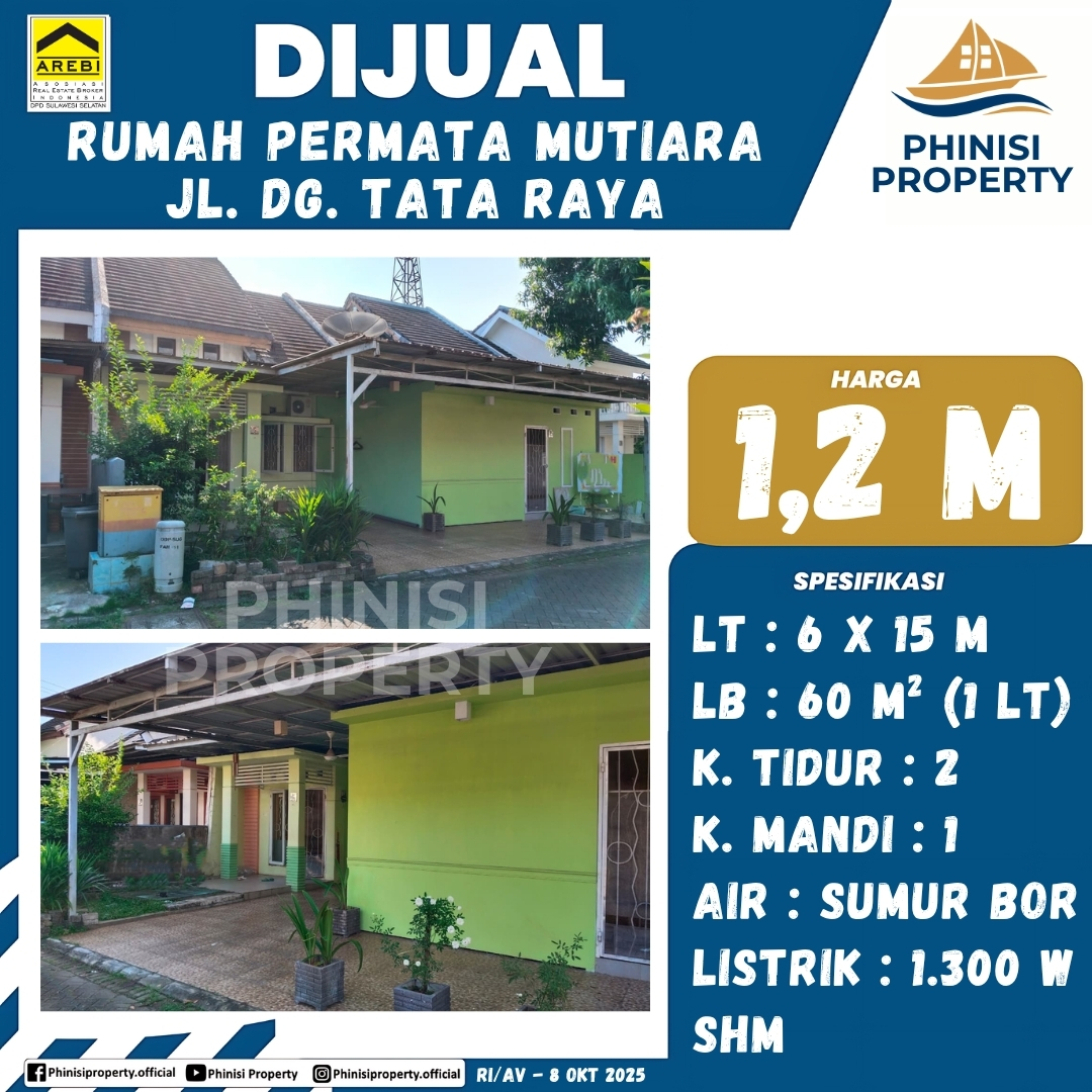 Temukan peluang menarik untuk memiliki Rumah Dijual di lokasi yang mudah dijangkau, Permata Mutiara, Jl. Dg. Tata Raya. Properti ini memiliki Luas Tanah (LT) 6 x 15 m dengan total luas 90 m2 (perkalian 6 m×15 m=90 m2 ). Bangunan 1 lantai ini menawarkan Luas Bangunan (LB) 60 m2 yang sudah tertata apik, sangat ideal bagi keluarga kecil. Unit ini dilengkapi dengan 2 Kamar Tidur (KT) dan 1 Kamar Mandi (KM). Dengan status kepemilikan Sertifikat Hak Milik (SHM), properti ini menawarkan legalitas yang jelas. Fasilitas yang tersedia mencakup pasokan Air Sumur Bor yang lancar serta daya Listrik 1.300 W. Lokasi yang strategis di Permata Mutiara menjadikan rumah ini pilihan hunian dan investasi yang cerdas.
