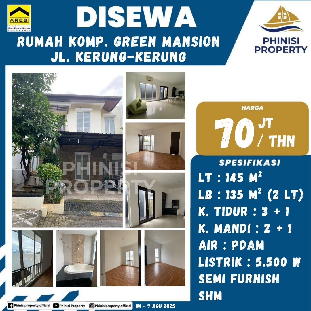 Rumah ini disewakan di Kompleks Green Mansion, Jalan Kerung-Kerung, sangat ideal bagi Anda yang mencari hunian nyaman dan modern. Rumah ini berdiri di atas tanah seluas 145 m2 dan memiliki luas bangunan 135 m2 dengan dua lantai. Terdapat 3 + 1 kamar tidur dan 2 + 1 kamar mandi. Rumah ini juga sudah dilengkapi dengan air PDAM, listrik berdaya 5.500 watt, dan semi-furnished. Dengan Sertifikat Hak Milik (SHM) yang tersedia, rumah ini menjanjikan kenyamanan dan keamanan bagi Anda dan keluarga.
