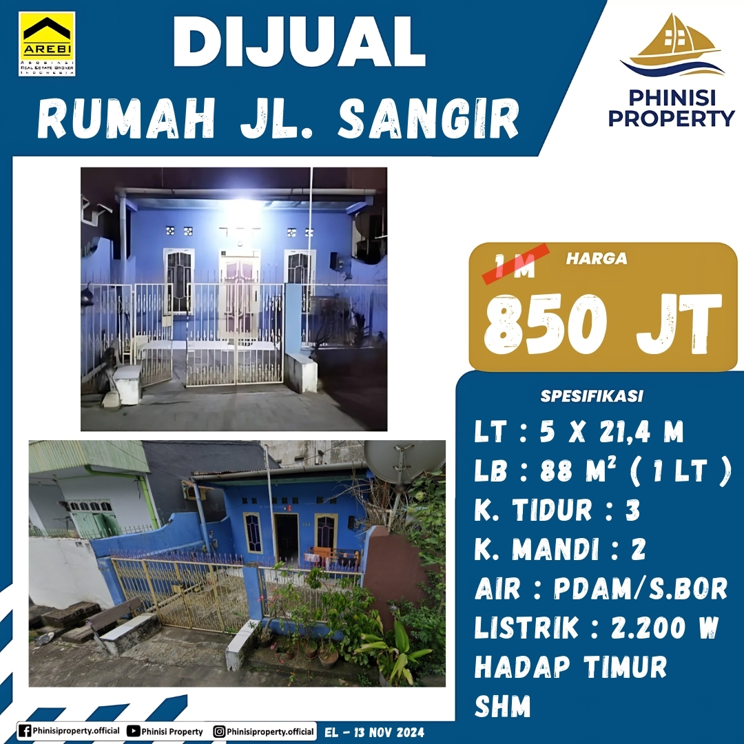 Rumah jl. Sangir LT 105 LB 88 Bangunan 1 lantai Lingkungan tenang Hadap Timur SHM