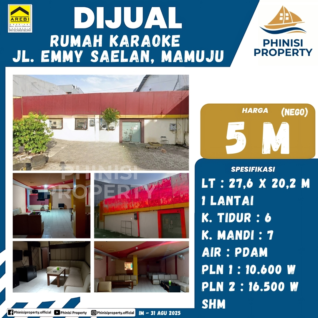 Dijual properti komersial berupa rumah karaoke di Jalan Emmy Saelan, Mamuju. Properti ini sangat cocok untuk investasi atau melanjutkan bisnis hiburan. Berdiri di atas lahan seluas 27,6 x 20,2 meter, atau 557,52 m2, bangunan satu lantai ini memiliki 6 kamar tidur dan 7 kamar mandi. Listriknya terbagi menjadi dua, yaitu 10.600 watt dan 16.500 watt, serta dilengkapi dengan air PDAM. Sertifikat Hak Milik (SHM) sudah tersedia, menjamin transaksi yang aman dan legal.