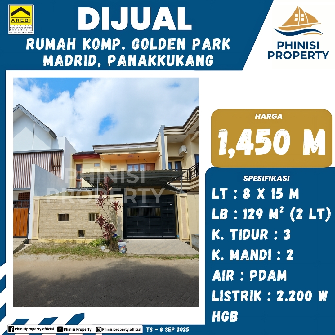 Rumah dua lantai di Kompleks Golden Park Madrid, Panakkukang ini adalah pilihan investasi yang sangat menarik. Properti ini memiliki luas tanah 8 x 15 meter atau 120 m² dan luas bangunan 129 m², dengan 3 kamar tidur dan 2 kamar mandi. Rumah ini dilengkapi dengan fasilitas air PDAM dan daya listrik 2.200W. Legalitasnya pun terjamin dengan Sertifikat HGB, menjadikannya pilihan yang aman dan menguntungkan di lokasi strategis.