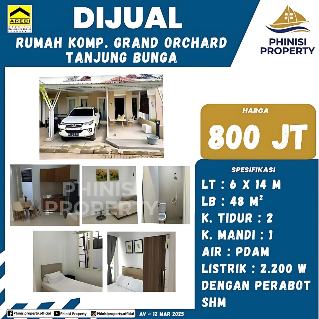 Rumah yang berlokasi di Kompleks Grand Orchard, kawasan prestisius Tanjung Bunga, ini adalah pilihan hunian yang ideal bagi Anda yang mencari rumah siap huni dengan desain minimalis. Dengan luas lahan 6 x 14 meter dan luas bangunan 48 m2, rumah ini menawarkan ruang yang efisien dan fungsional. Properti ini dilengkapi dengan dua kamar tidur dan satu kamar mandi, sangat cocok untuk keluarga kecil. Keunggulan lainnya adalah rumah ini dijual lengkap dengan perabot, sehingga Anda bisa langsung pindah tanpa repot. Fasilitas dasar seperti pasokan air PDAM dan daya listrik 2.200 watt juga sudah tersedia. Dengan sertifikat Hak Milik (SHM) yang menjamin legalitas, rumah ini tidak hanya menawarkan kenyamanan, tetapi juga merupakan investasi properti yang solid.