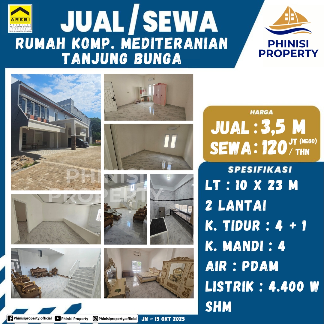 Dapatkan hunian mewah di Rumah Komp. Mediteranian Tanjung Bunga dengan pilihan skema Jual / Sewa yang strategis. Rumah 2 lantai ini menawarkan Luas Tanah (LT) 10 x 23 m dengan total luas 230 m2. Properti ini sangat ideal untuk keluarga besar, dilengkapi dengan 4+1 Kamar Tidur (KT) dan 4 Kamar Mandi (KM) yang memadai. Legalitas properti sudah terjamin dengan Sertifikat Hak Milik (SHM). Fasilitas pendukung mencakup daya Listrik 4.400 W dan pasokan Air PDAM yang lancar. Lokasi di kompleks elit Tanjung Bunga menjamin lingkungan yang aman dan nyaman, menjadikan properti ini aset investasi dan hunian yang premium.