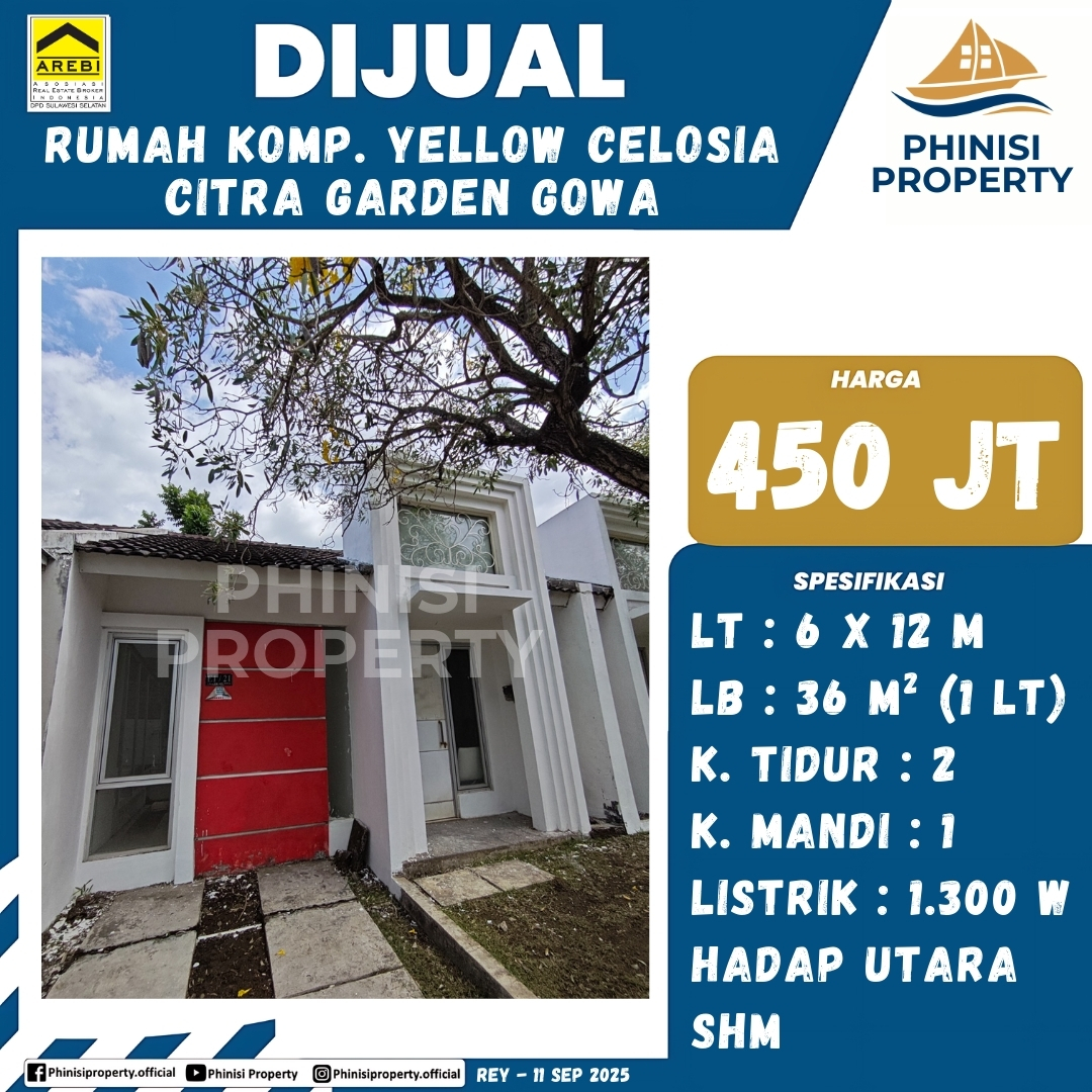 Mencari hunian minimalis yang nyaman dan strategis? Rumah yang satu ini terletak di Kompleks Yellow Celosia, Citra Garden Gowa. Dengan luas tanah 72 m² (6 m x 12 m) dan luas bangunan 36 m², rumah satu lantai ini menawarkan ruang yang fungsional dan ideal untuk tempat tinggal. Dilengkapi dengan 2 kamar tidur dan 1 kamar mandi, rumah ini cocok untuk pasangan muda atau keluarga kecil. Dengan daya listrik 1.300 W, rumah ini siap dihuni. Menghadap ke utara dan berstatus Sertifikat Hak Milik (SHM), properti ini menawarkan kepastian dan keamanan investasi properti jangka panjang.